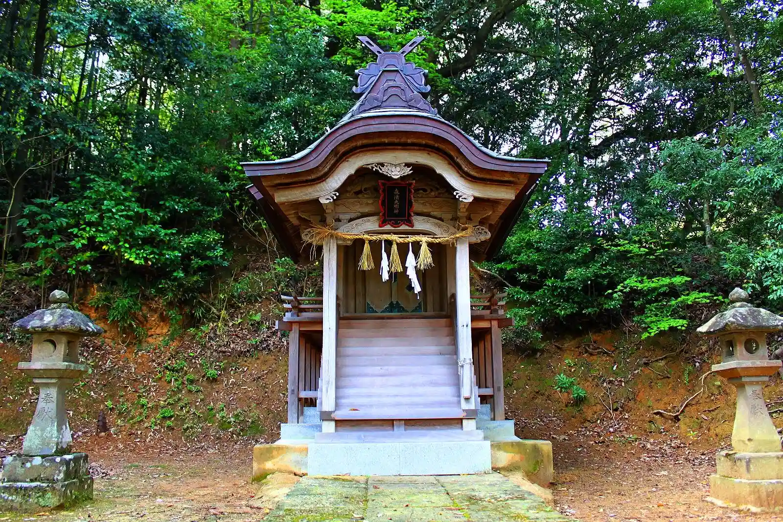 境内には神楽殿があるものの拝殿はなく、本殿に直接お参りする形になります。綺麗な本殿で、扁額は彩色が施してあり雲陽誌で記載されている森清大明神の名が刻んでありました。