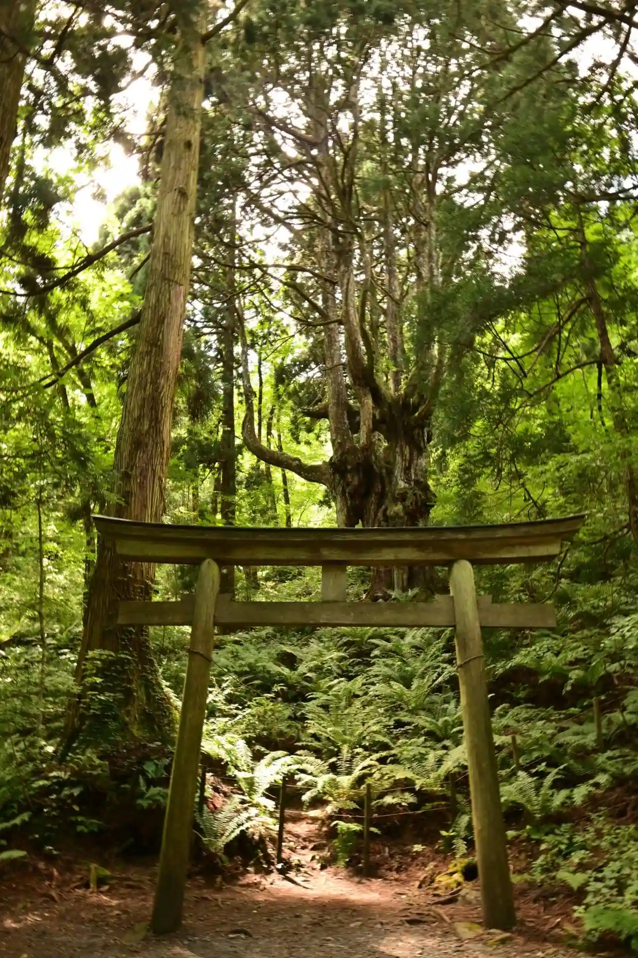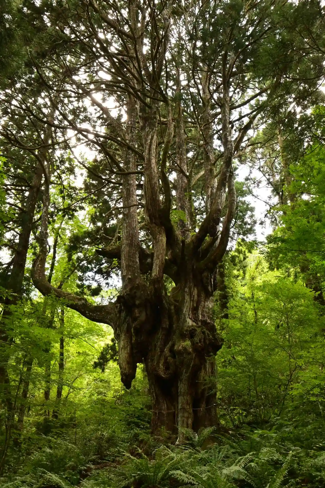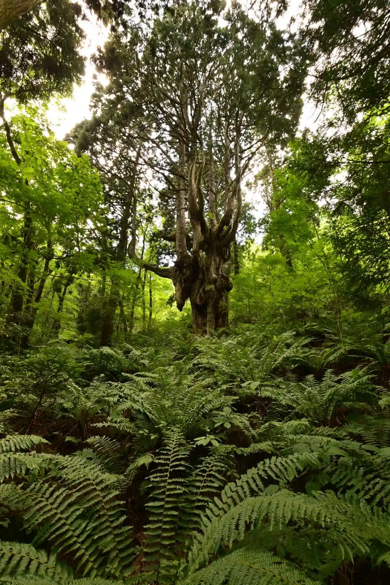 森の中に佇む杉の巨木です。シダが茂り神秘的な雰囲気です。自然のエネルギーを感じます。