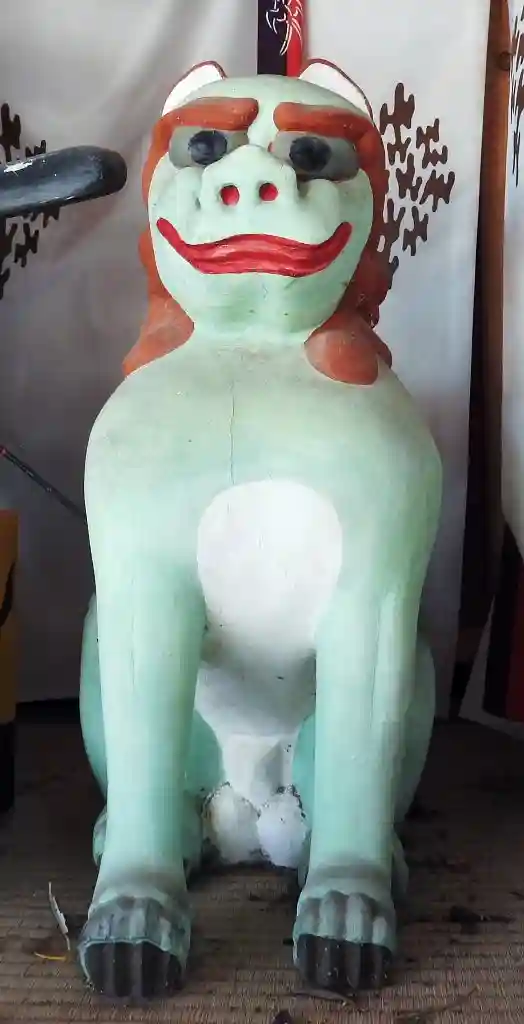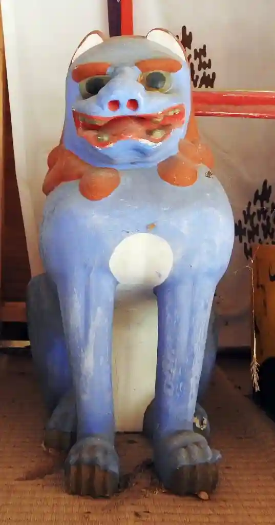 狛犬尽くしの神社です、、随神門の中には明るい青とうぐいす色の一対の木造神門狛犬、6対の石造狛犬、木…