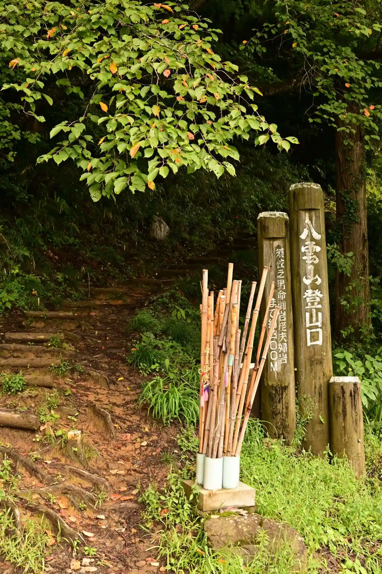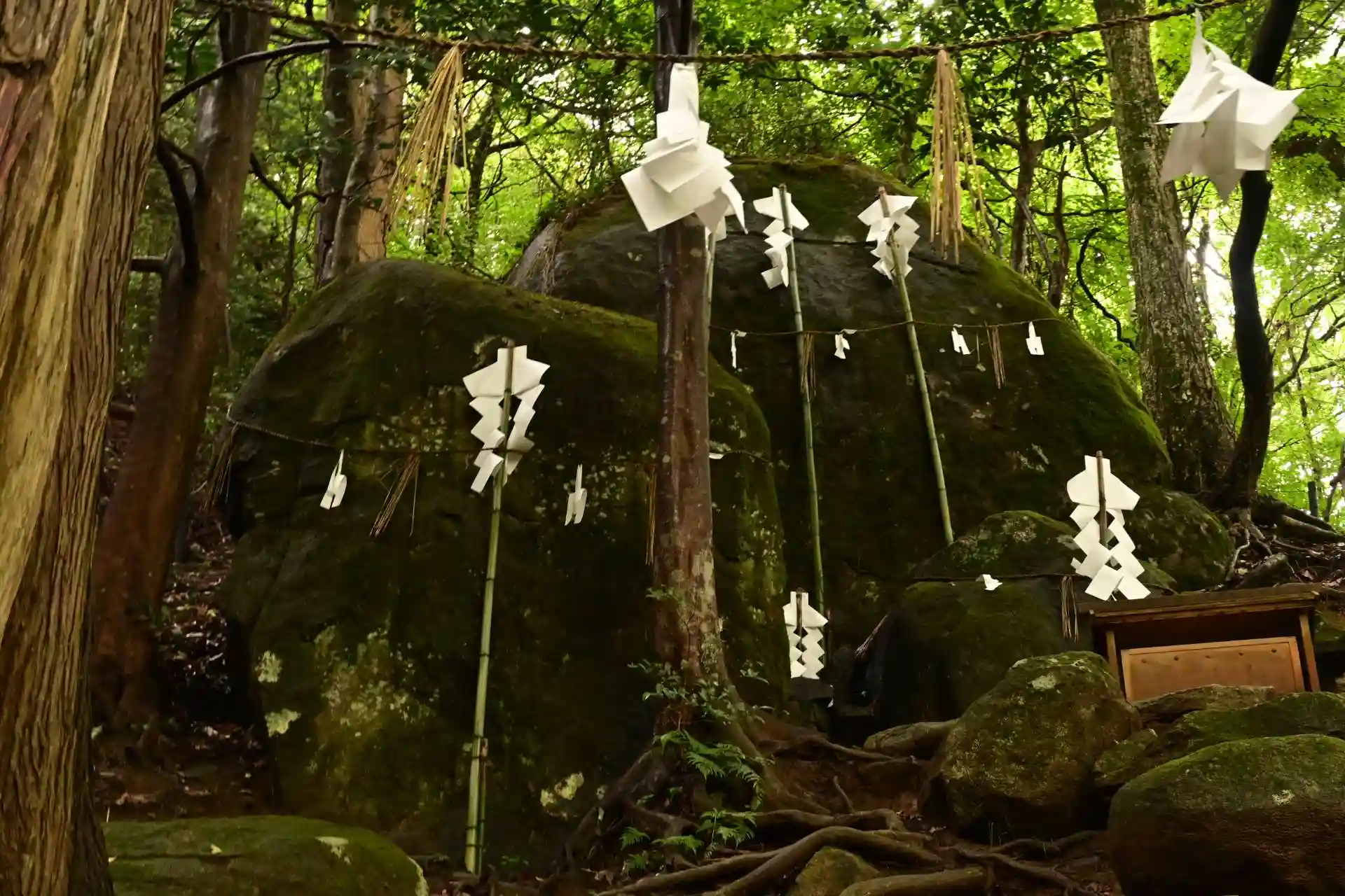 須我神社奥宮は、島根県雲南市大東町須賀、神々の宿る山、八雲山の中腹に鎮座します。須我神社から山の方へ2キロほど行くと八雲山への登山口があり、そこからおよそ400m登ると、奥宮である夫婦岩に出会えます。夫婦岩は3つの岩が寄り添い合っており、須佐之男命、稲田比売命、二人の子の清之湯山主三名狭漏彦八島野命を祀っています。