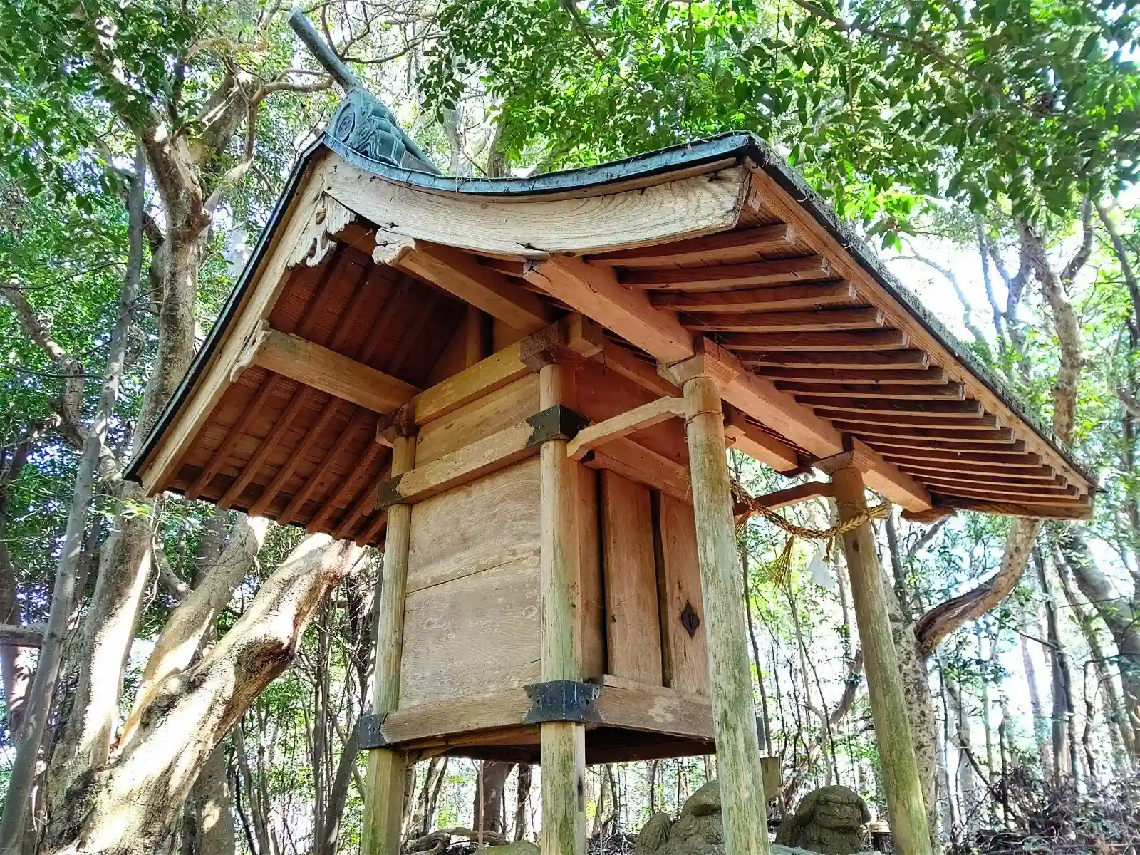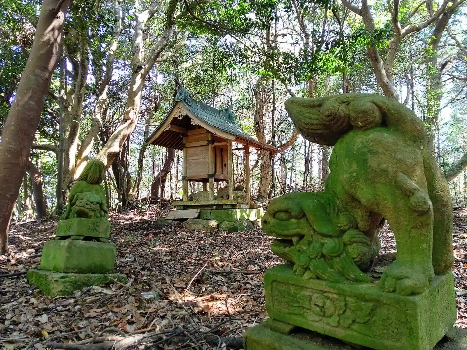 かなり規模が小さい神社でしたが、社殿のほかに小振りの手水鉢や出雲構えの獅子が対で設置されていて、ちゃんとした神社の設備になっていました。大昔にこんな山の上へどうやって持って上がったのだろうと驚きです。注連縄が新しかったので今でもきちんとお祀りされているようですね。
