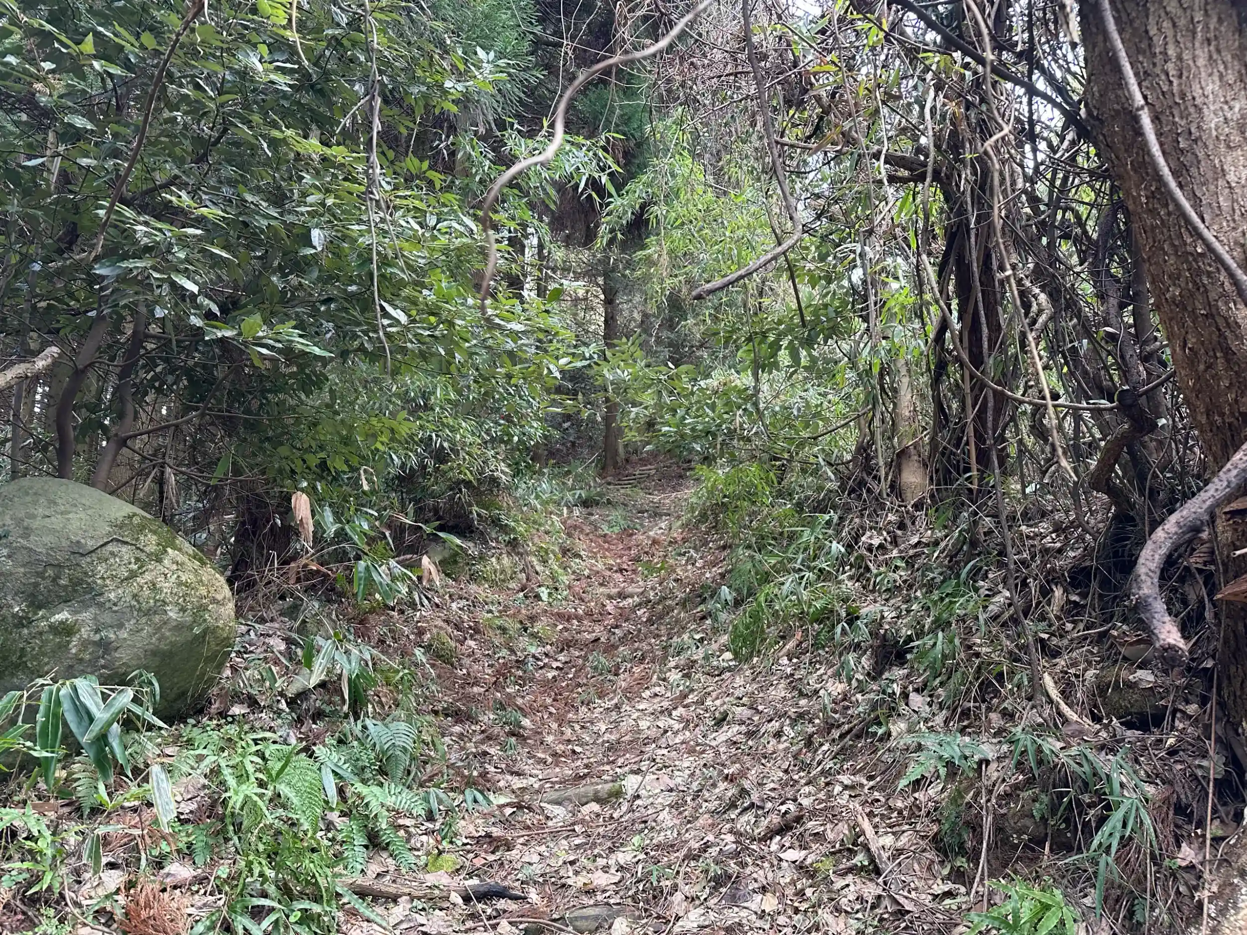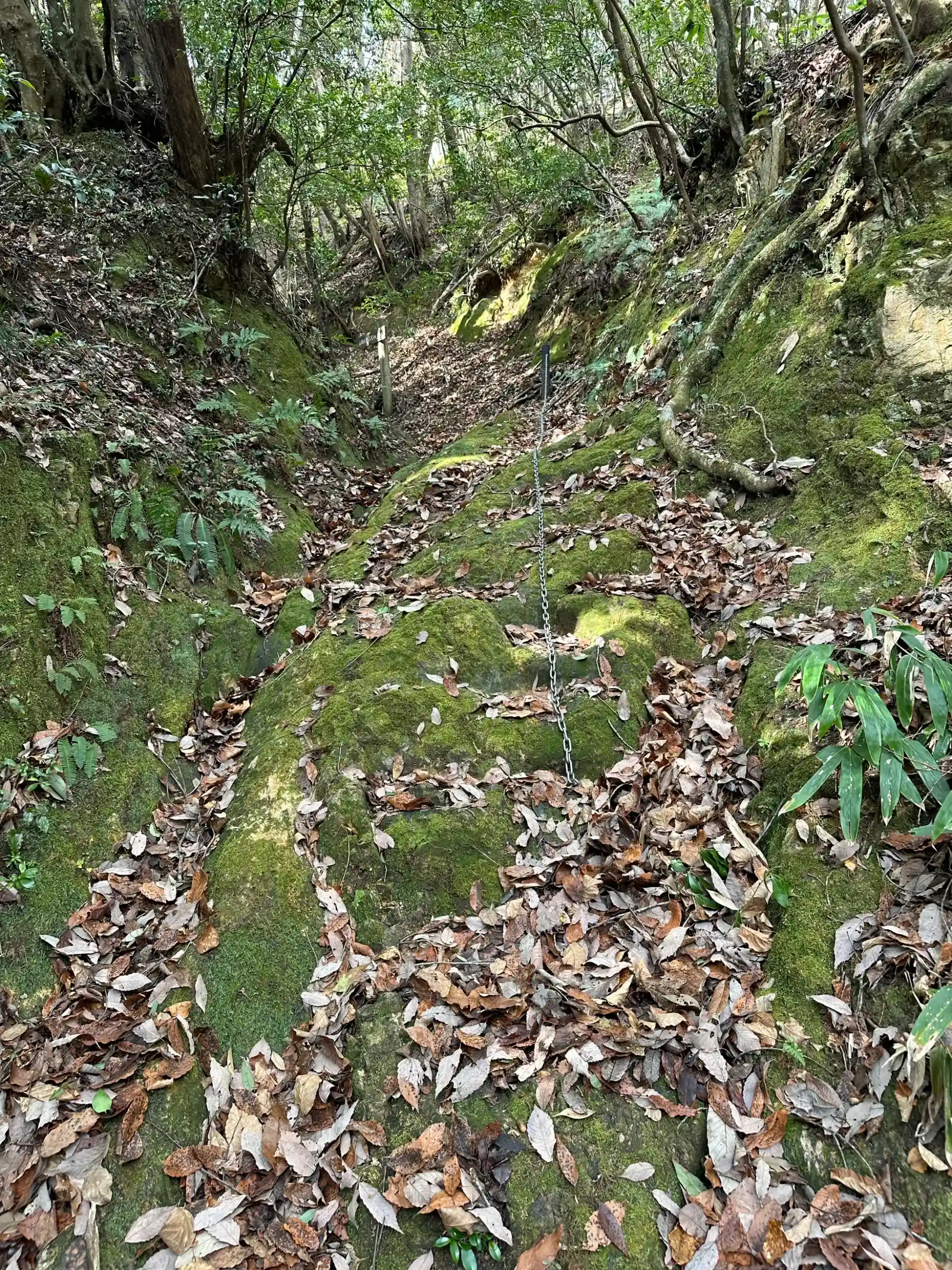 緩やかに登っていく坂道であるため軽装でも行くことはできます。落ち葉で滑りやすいので注意。