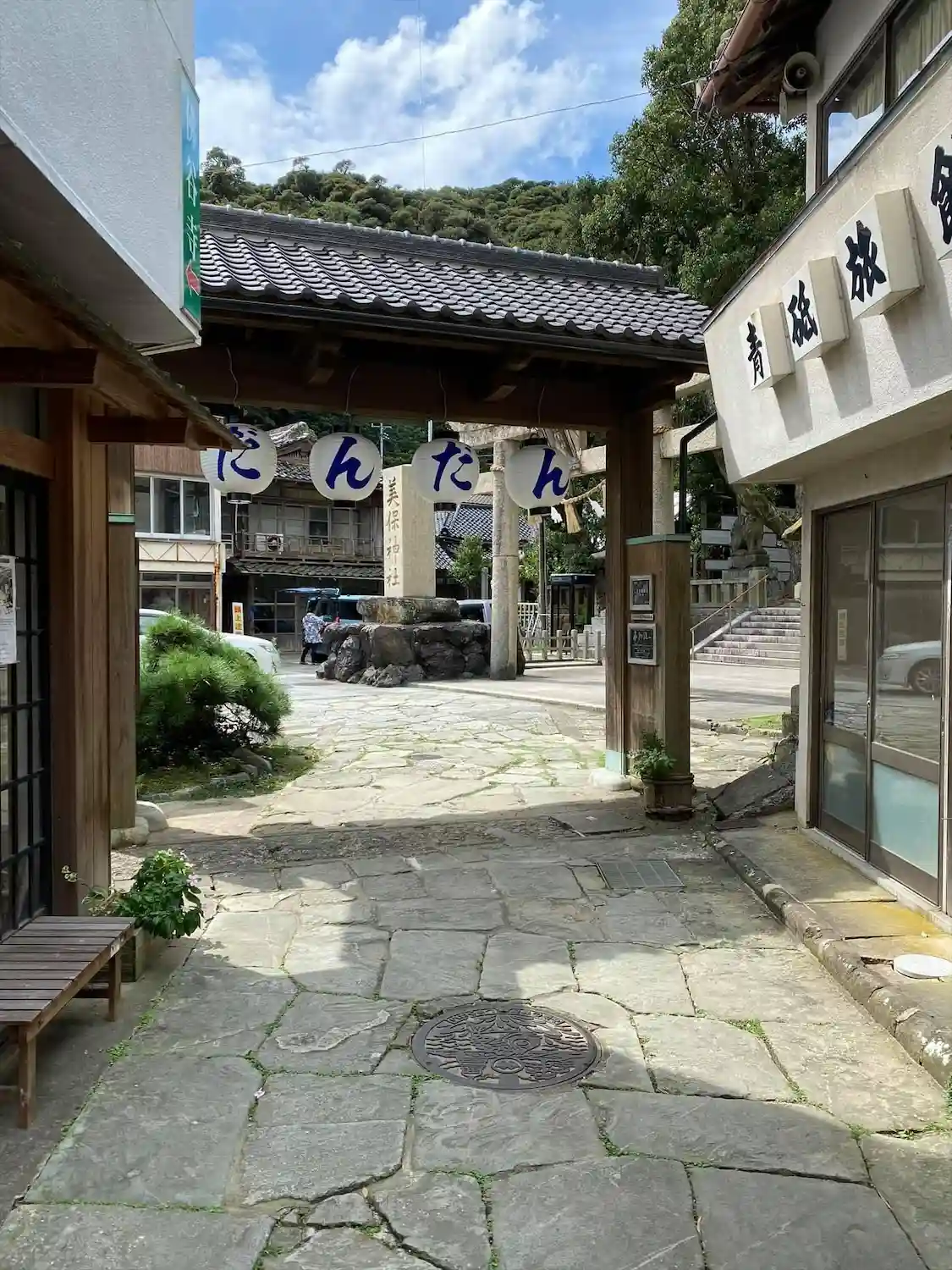 目の前に美保湾が広がり、海の香りにただよう港町に建っています。鳥居の前には雨で濡れると淡い青色になる石畳が敷かれ、青石畳通りと呼ばれる昔懐かしい通りが続いています。