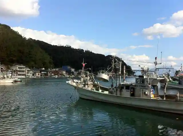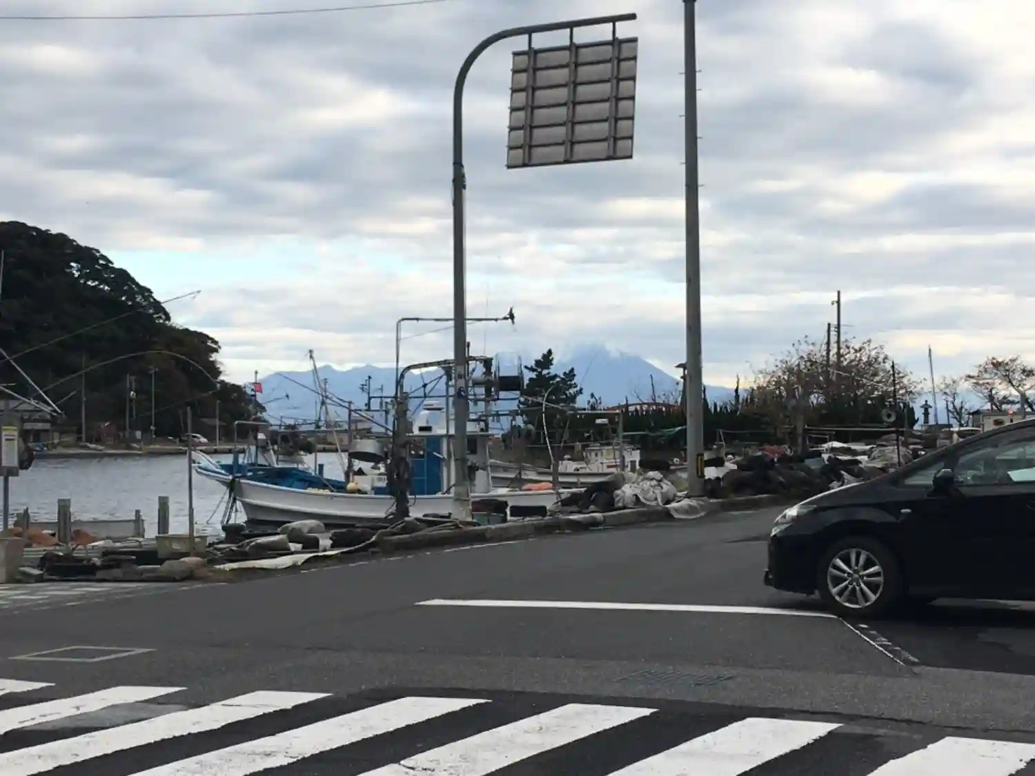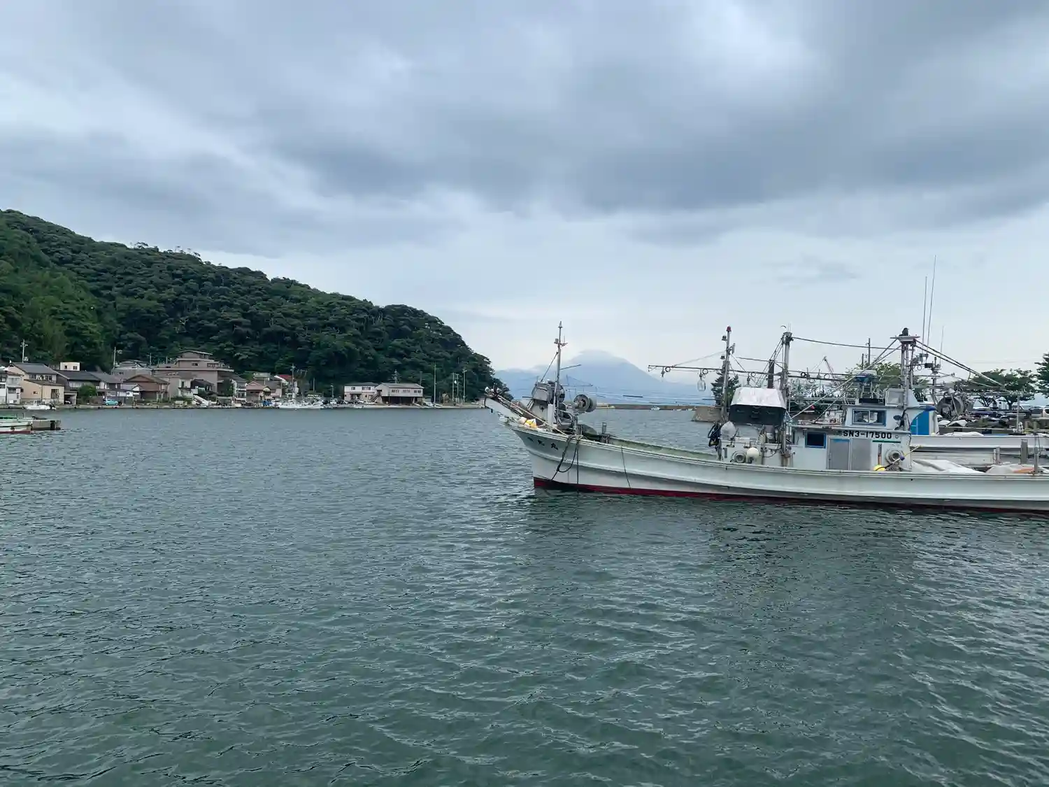 美保神社の入口前は港になっていました。その奥には大山が見えました。