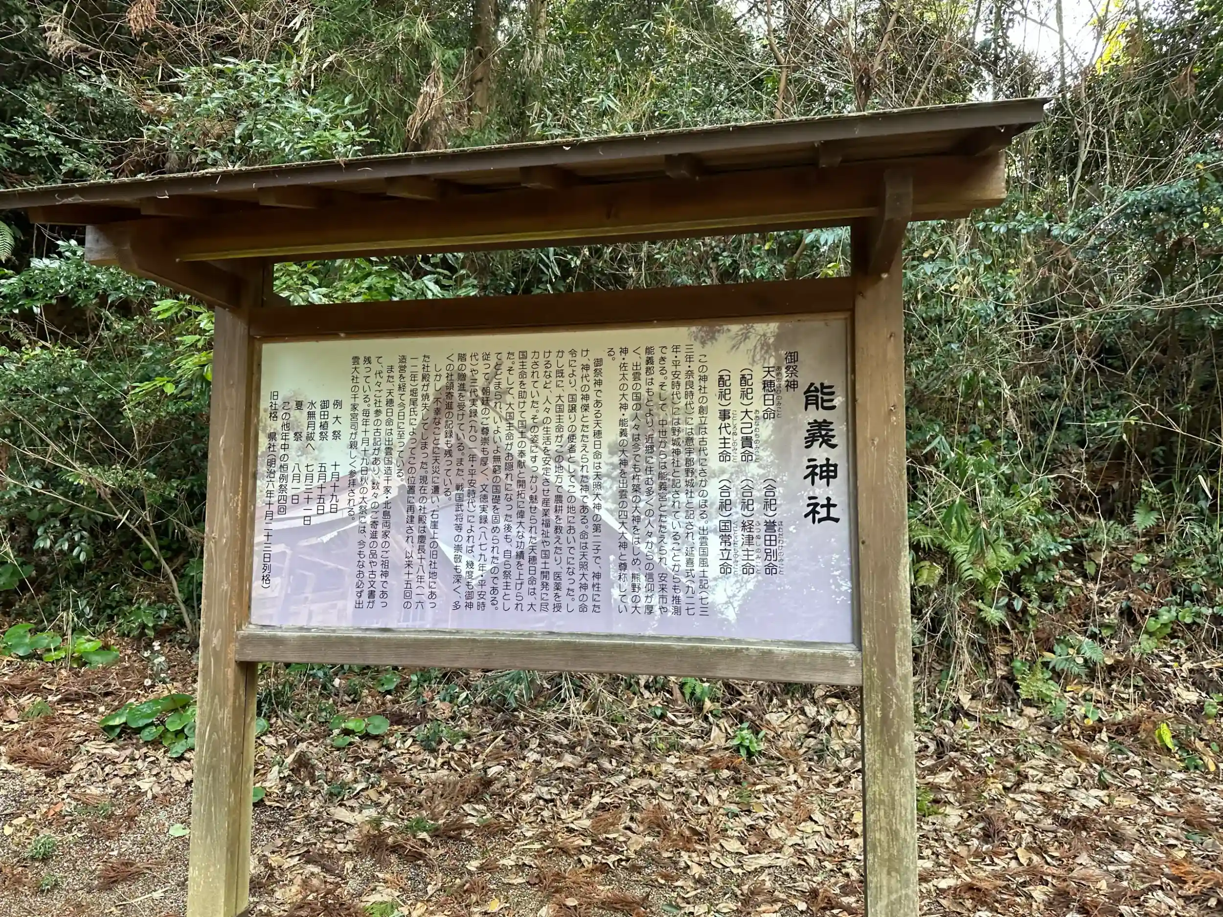 六国史の一書である『日本三大実録』にて「能義神」に対して従五位上→正五位下の神階授与の記録がありますが、これが能義神社なのか能義郡鎮座の天穂日命神社なのかが定かではないそうです。