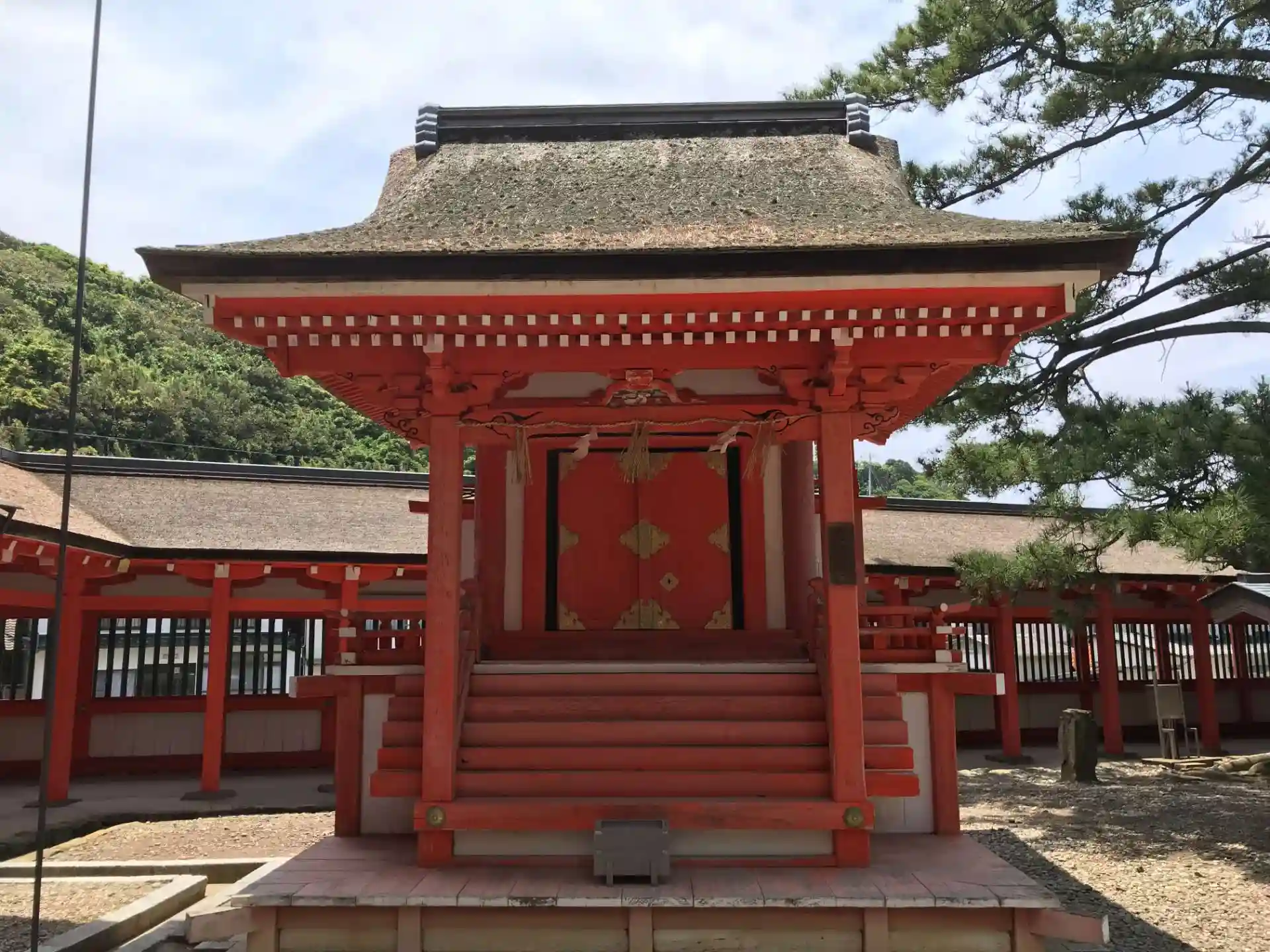 アマテラスを祀る下の宮の日沉宮(ひしずみのみや)は、海岸の経島(ふじま)に鎮座していたが948年に、村上天皇の勅命により現在地に遷座された。
