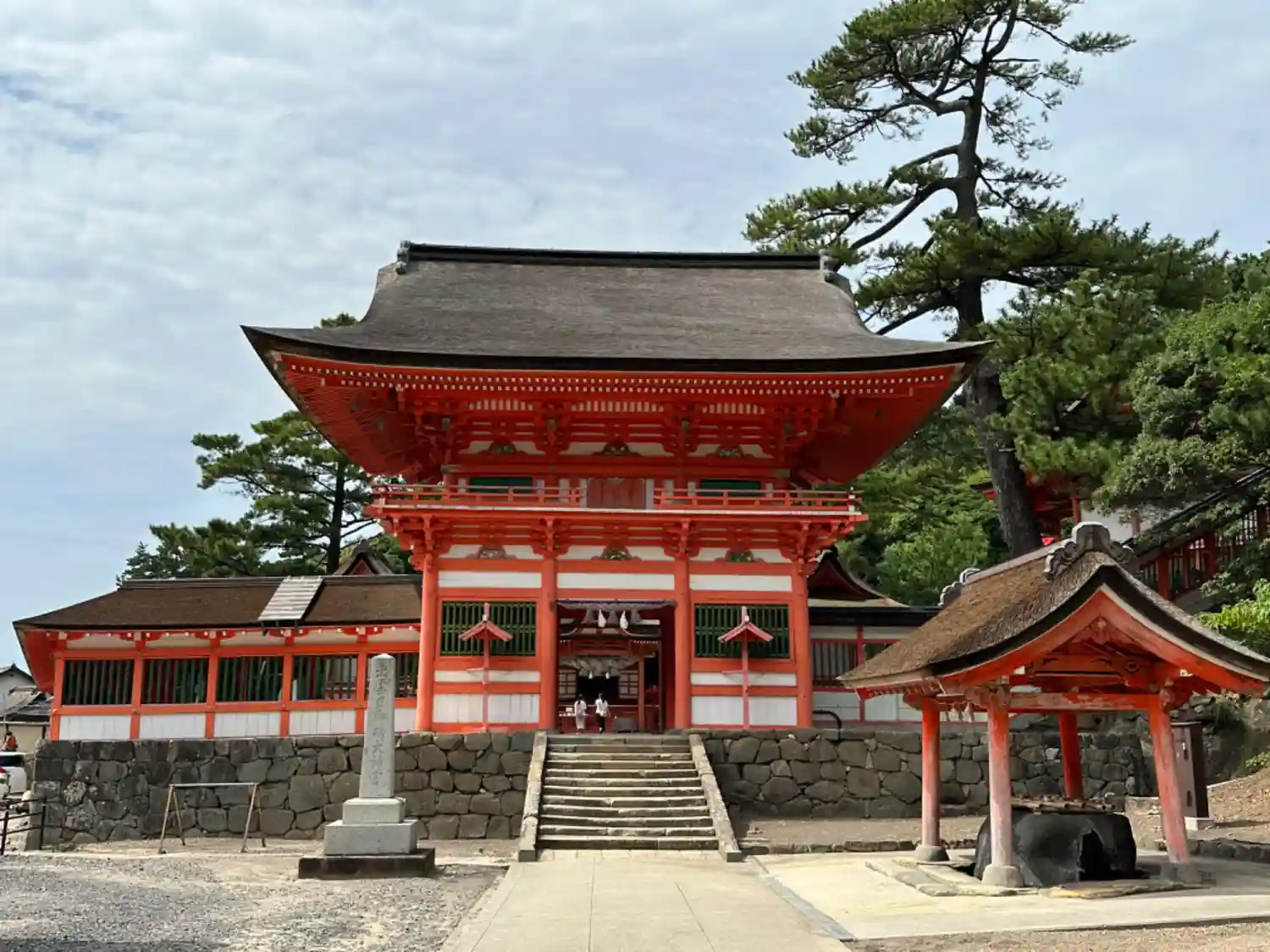 楼門からまっすぐ進むと<日沉宮(ひしずみのみや)>。御祭神は天照大御神(あまてらすおおみかみ)。もともと沖合の小島「経島(ふみしま)」に鎮座していたが、948年村上天皇の命により現在地に移したとされる。国指定重要文化財。