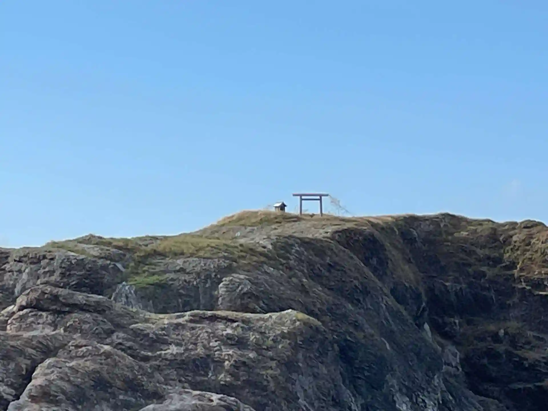 と その漁港の先に大きな岩山があり そのてっぺんに鳥居が見えるではないですか。
