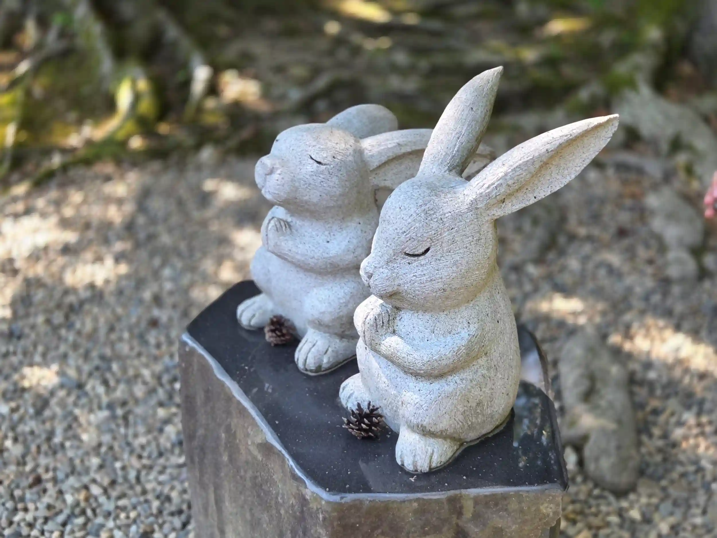 境内にはいたるところにうさぎの像があるのですが、一番印象に残ったのは本殿後方にある像の中でも本殿に向かって手を合わせている二匹のうさぎ像。