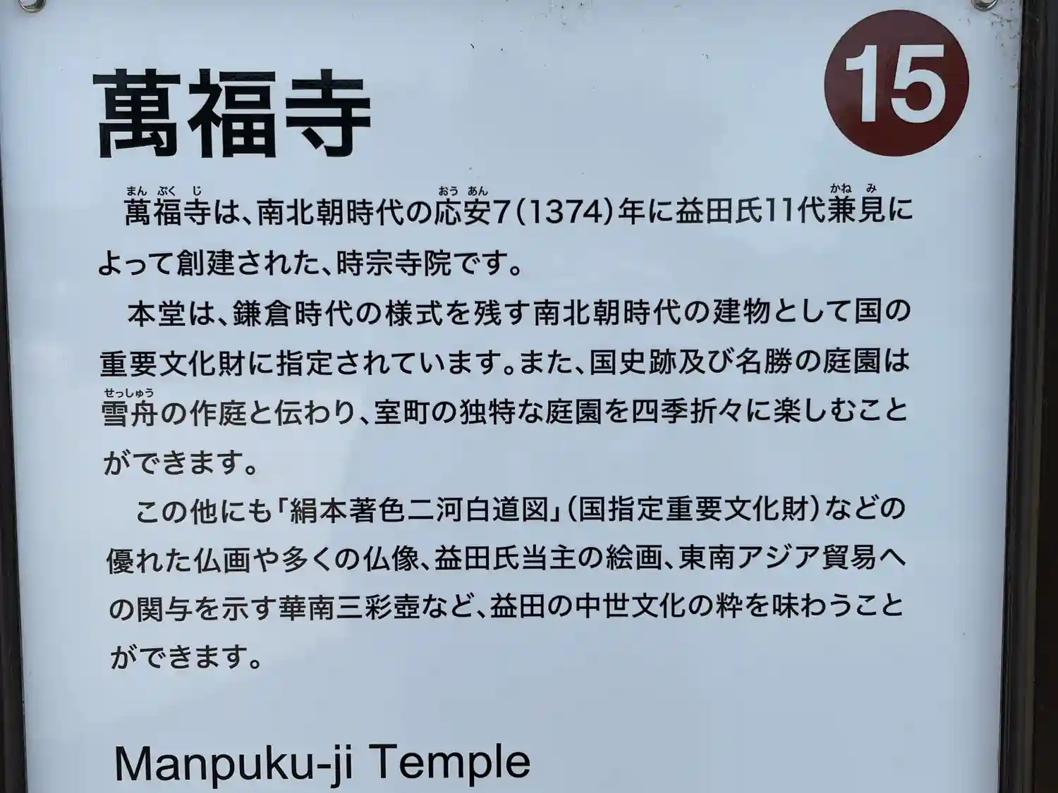 萬福寺庭園等の御由緒書きです。