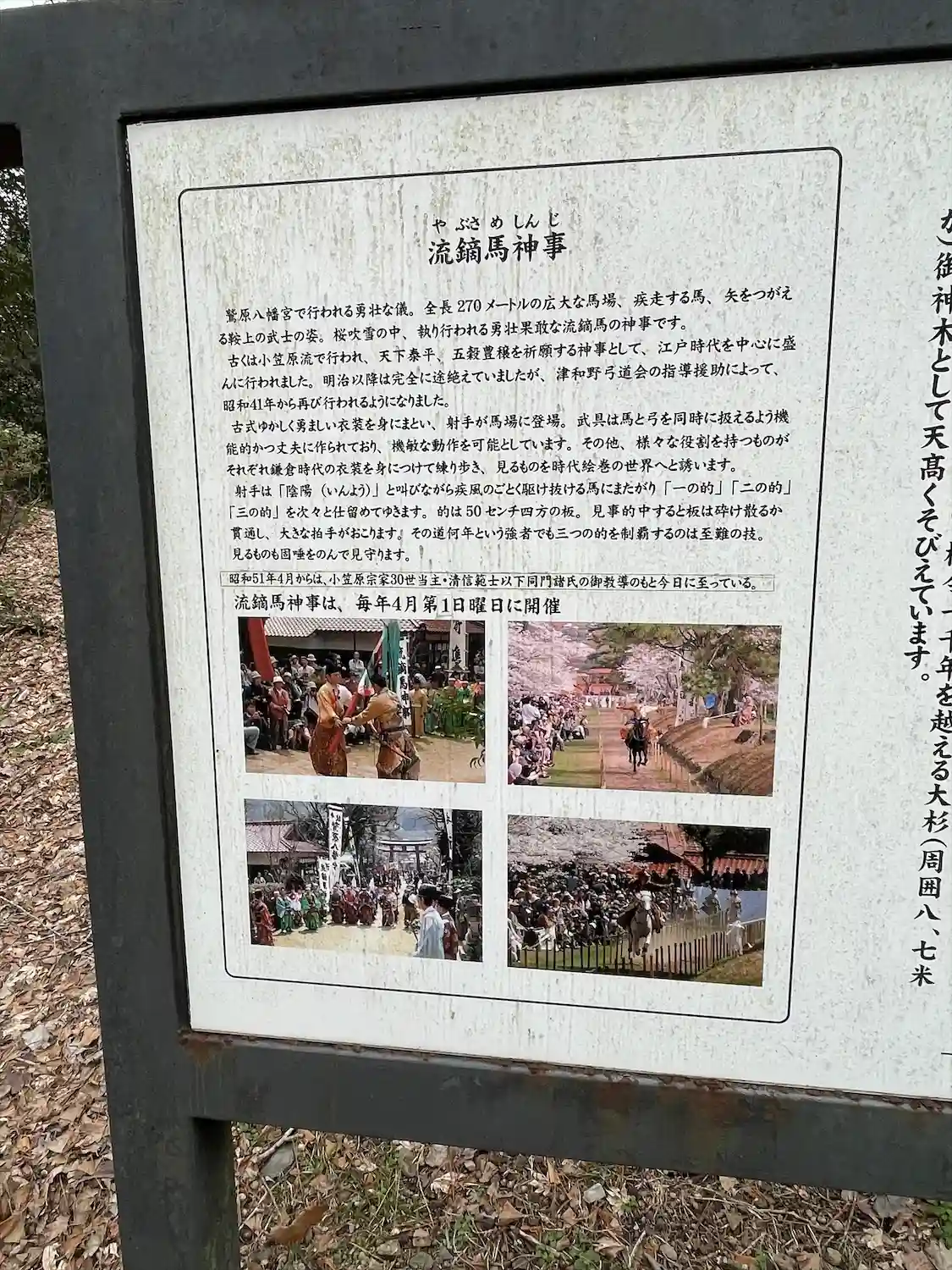 本殿(重文), 拝殿(重文), 楼門(重文), 鳥居, 流鏑馬馬場, 主祭神は誉田別尊・玉依姫命・息長足姫尊, 旧村社
