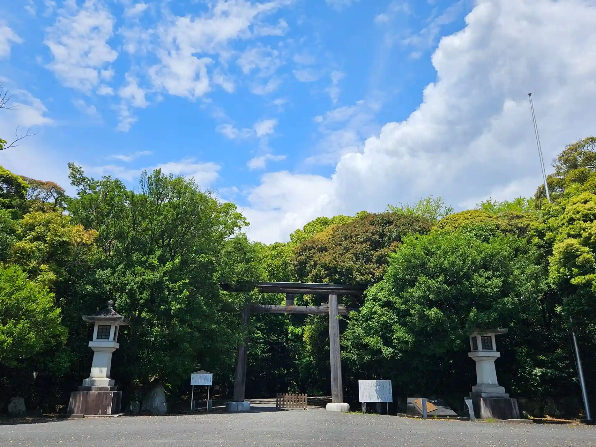 よすぎるくらい良いお天気の青空、開けた境内、そして緑を背面にした本殿。