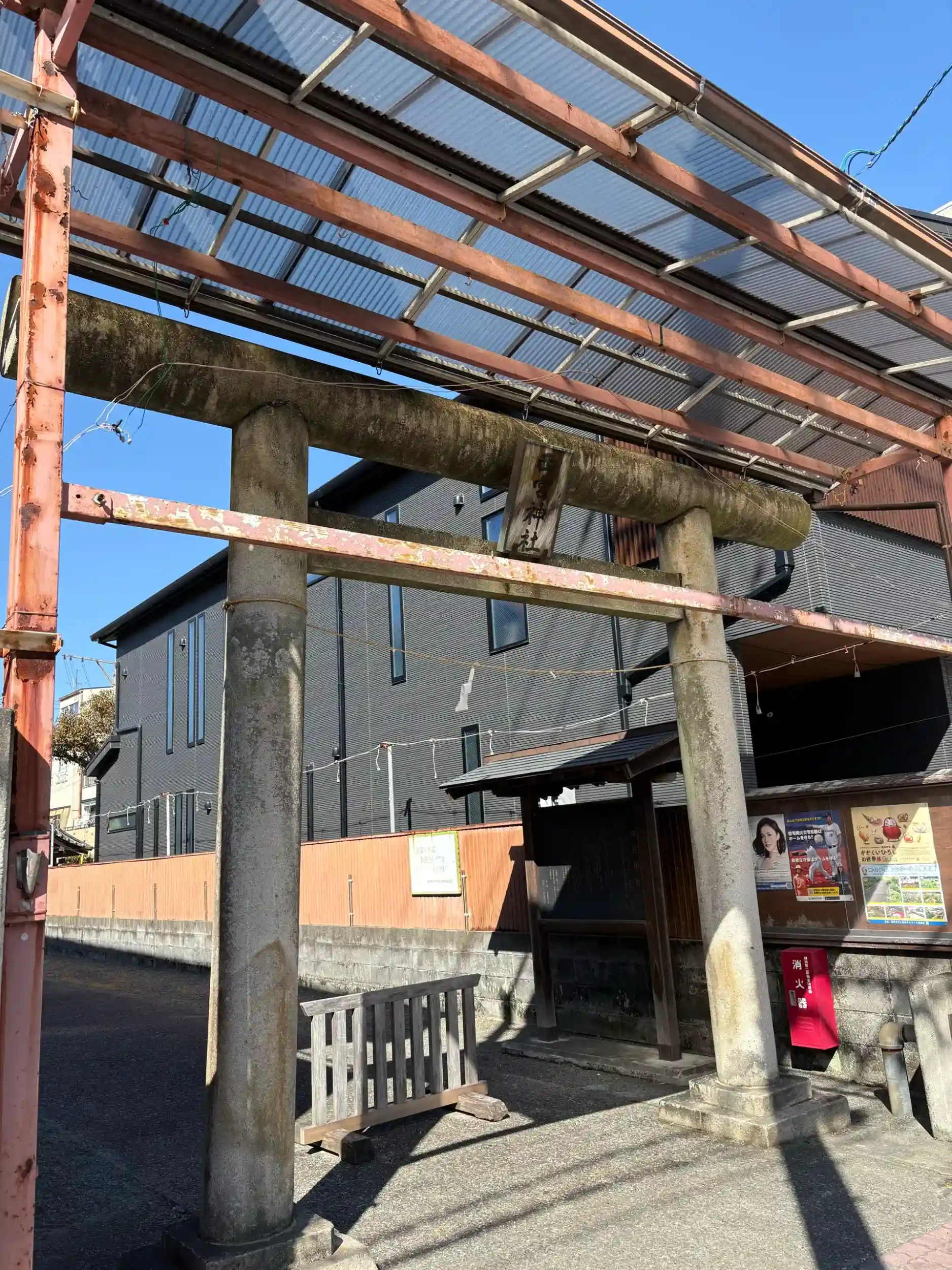 片側1車線ですの比較的広い道に入口があり屋根付き鳥居があります 看板も電信柱の高いところにあるので鳥居を見つけるのが難しいですが迷うことはないと思います