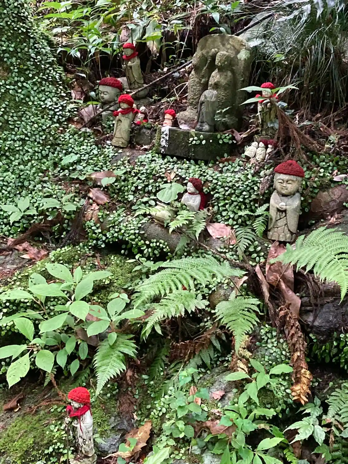 赤い帽子とよだれかけを付けた大小のお地蔵さんが、まるでもののけ姫の木霊のよう。苔むした古いものから新しいものまで。中には古いキューピー人形もあったりして。