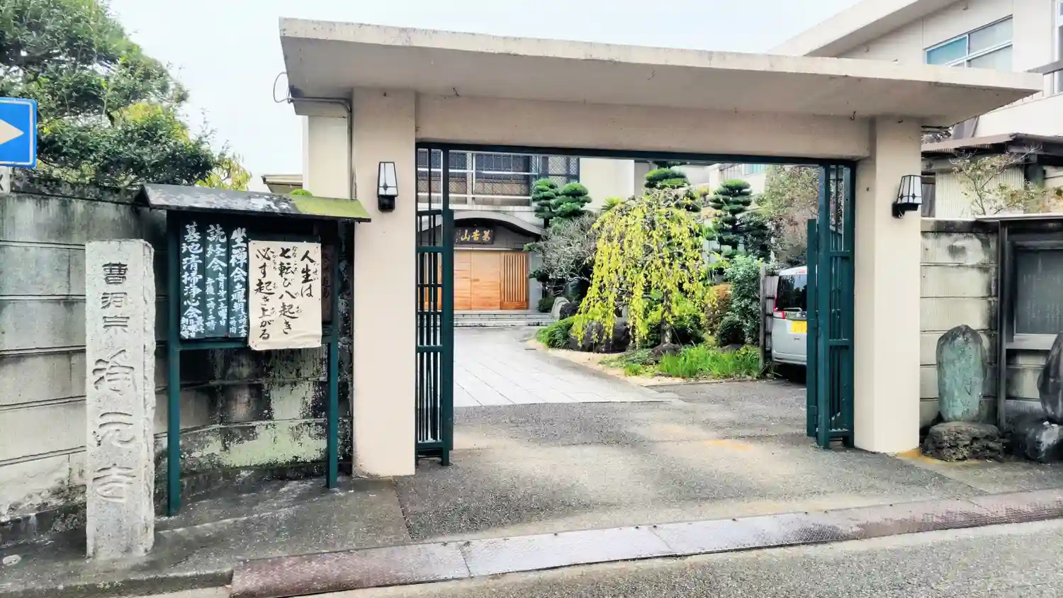 お寺の左側が墓地になっていて駐車スペースがありました。前の道が一方通行なので、お寺の裏をぐるりと回…