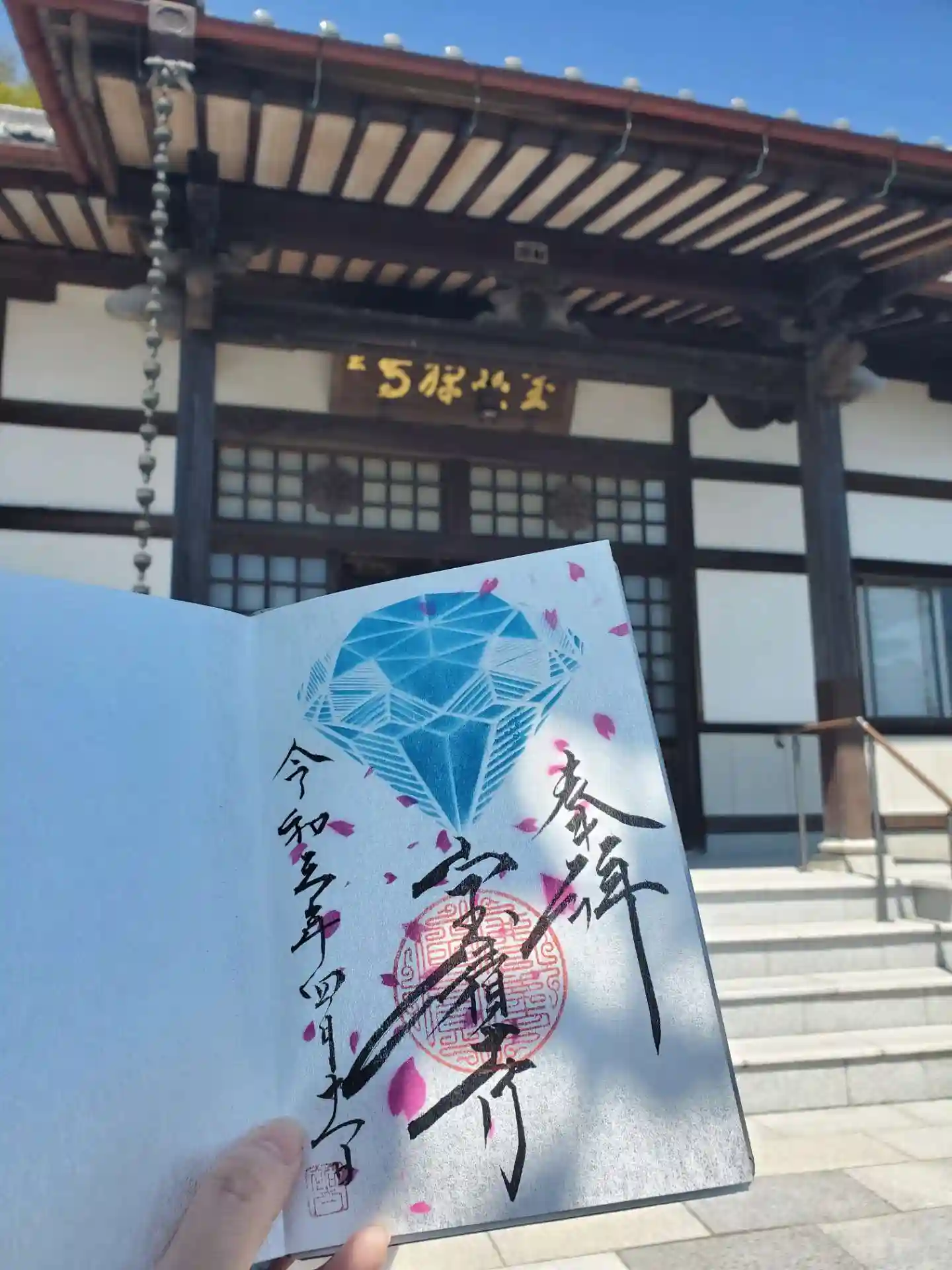 今回は書き置きの4月のアート御朱印のフリージアと大漁満足、職場の先輩用に新型の1月の誕生石御朱印(ガーネット)、4月の直書き御朱印の4月の誕生石ダイヤモンド×桜吹雪を頂きました。