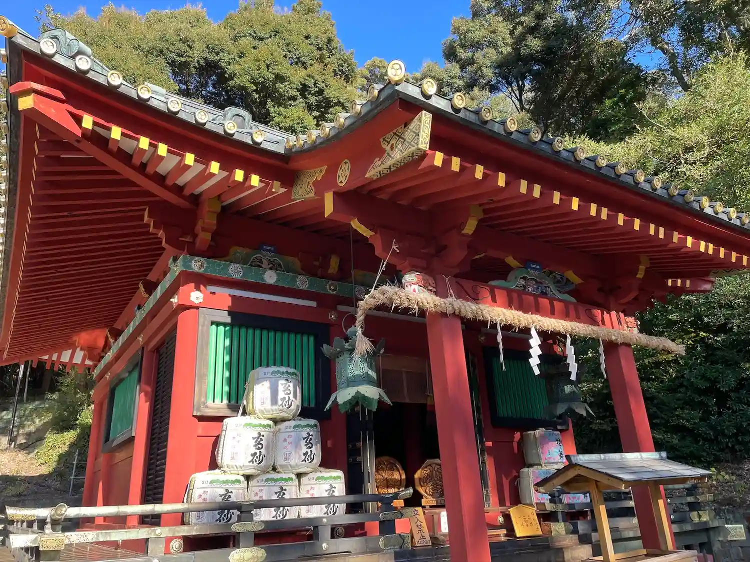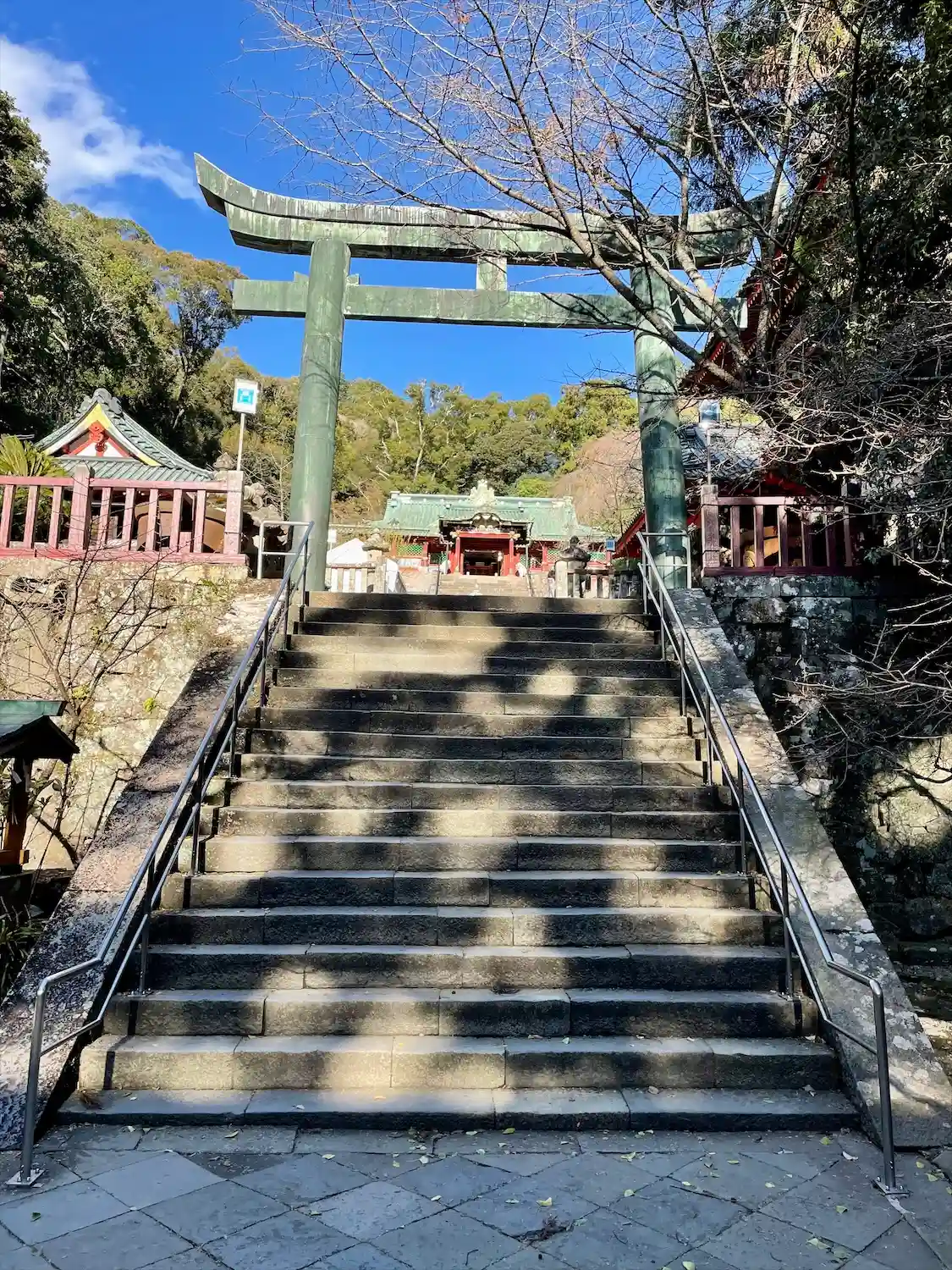 駿河湾に面した久能山の南斜面に設けられた表参道(1159段の曲がりくねった石段)を登った上に神社がある。