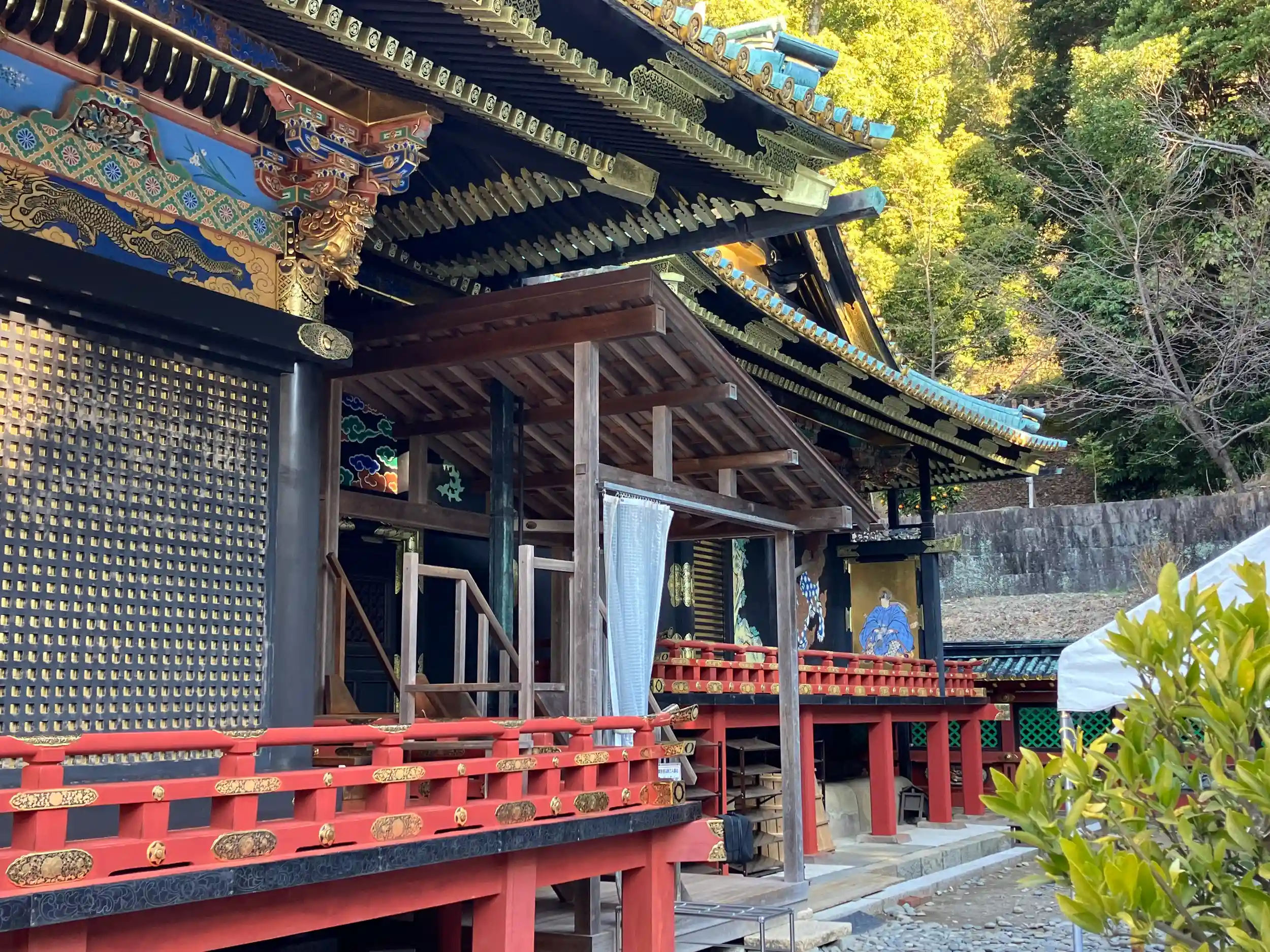 本殿の一番奥の垂木は三つ葉葵の紋が逆さに入っており建物が未完成であることを表している。