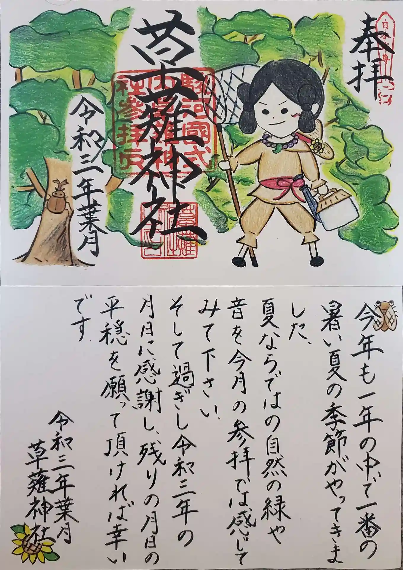 境内の緑と虫取りをしている日本武尊をイメージしている御朱印です。