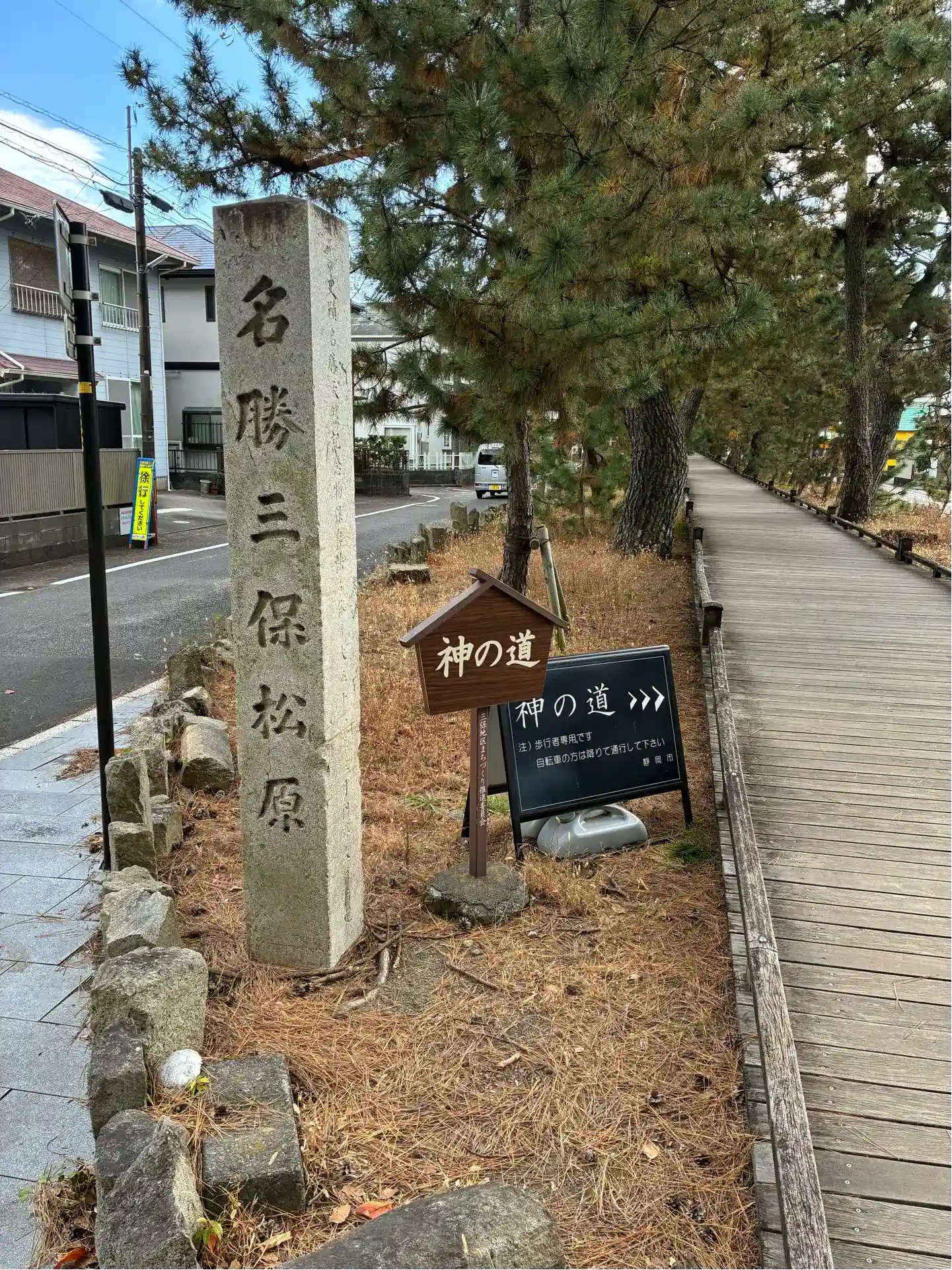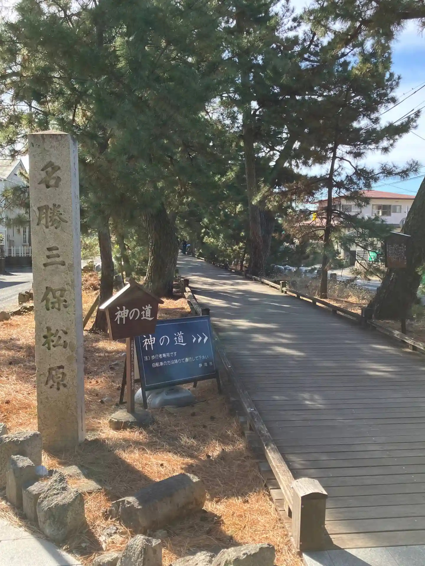 御穂神社の境内を抜けると、三保松原へと続く約500mの松並木、通称「神の道」があります。