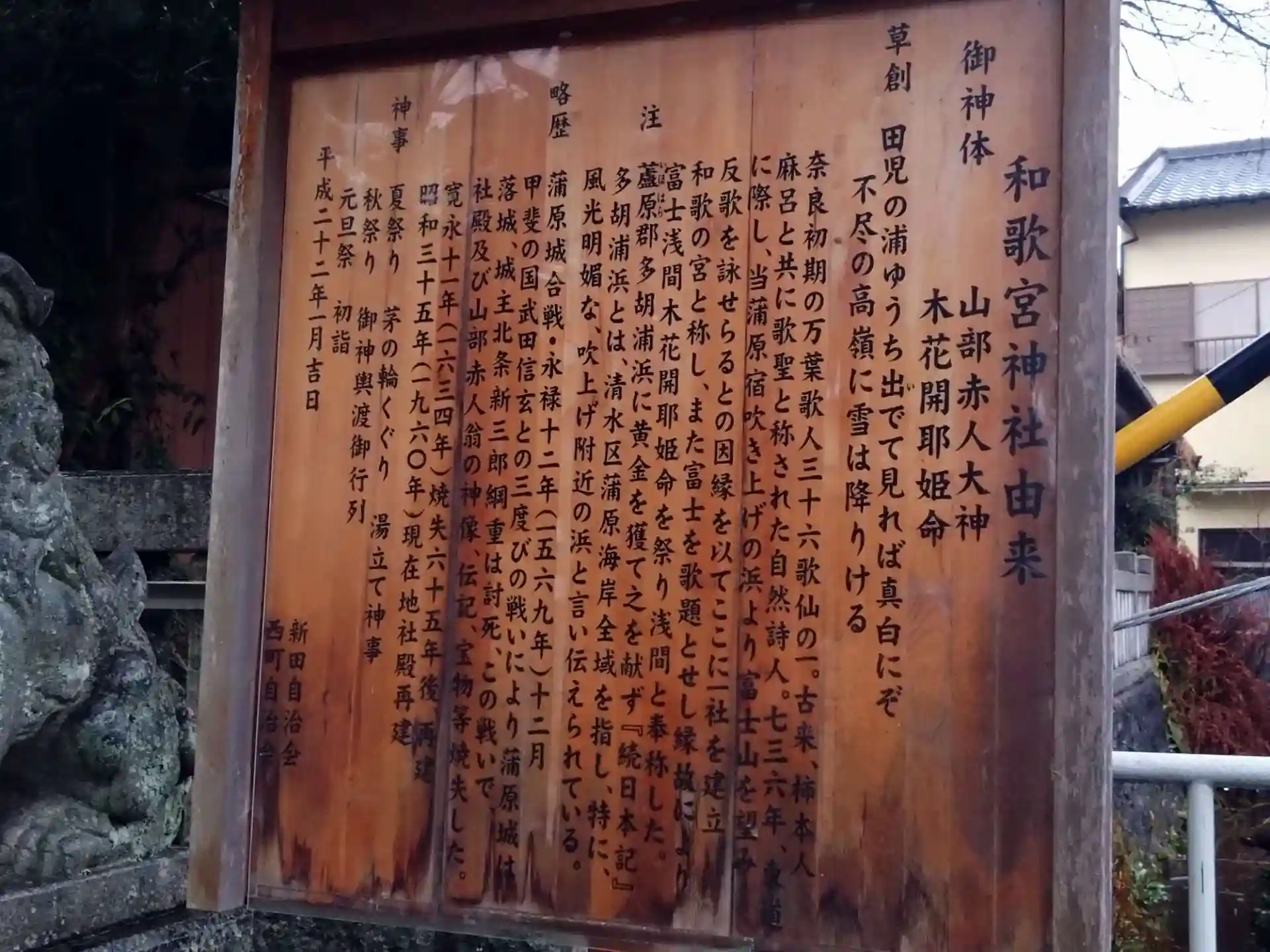 「田子の浦にうち出でて見れば白妙の 富士の高嶺に雪は降りつつ」で有名な山部赤人を祀る神社です。さっぱり知らない私が唯一知ってる歌です。歴史的にも和歌との関わりが深いようです。