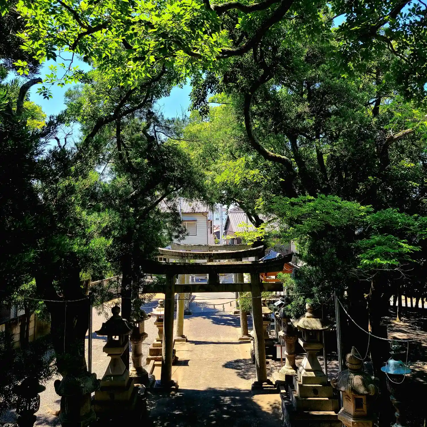 当社は、JR東海道本線・弁天島駅の南東1kmの、浜名湖と外海が繋がる今切口舞阪堤、舞坂漁港近くの住宅密集地帯の中にある。海辺の近くの元漁師町でほとんどが平坦だが、当社境内のみ小高くなっている。境内サイズは旧郷社格相当でなかなかの広さがある。漁業の盛んな地域の氏神で、水産・漁業の守り神として古来漁民の信仰を集めてきたということなので、そう思って境内を歩くと、漂う潮の香りとともに海辺の古社の雰囲気がある。