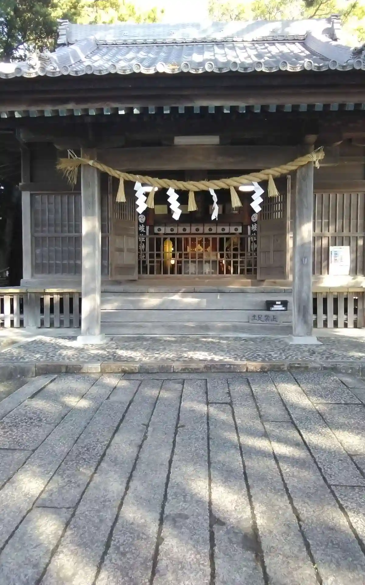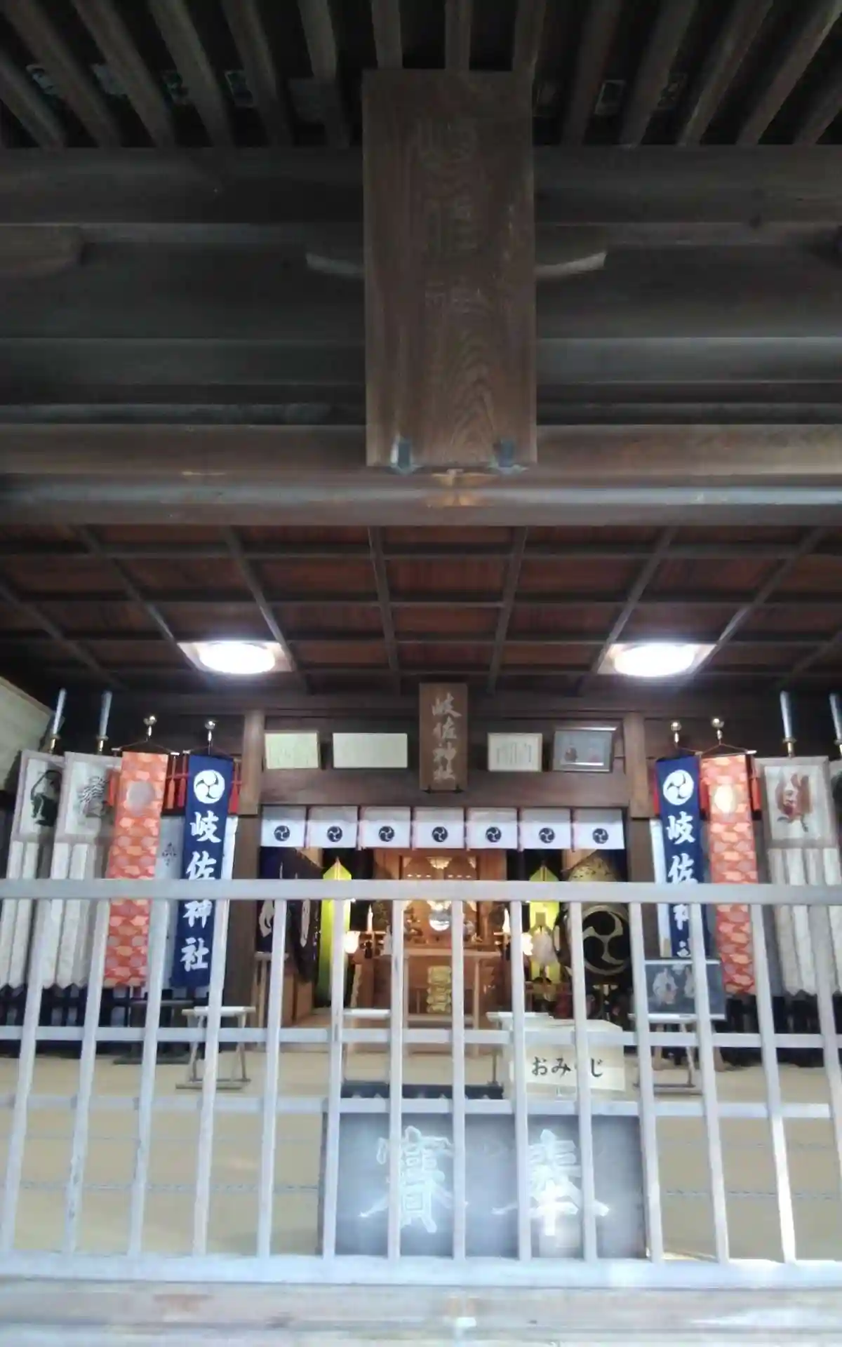 <拝殿>正面。「岐佐神社」と刻まれた簡素な扁額。