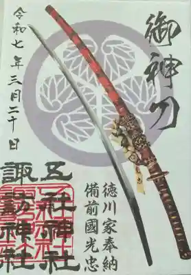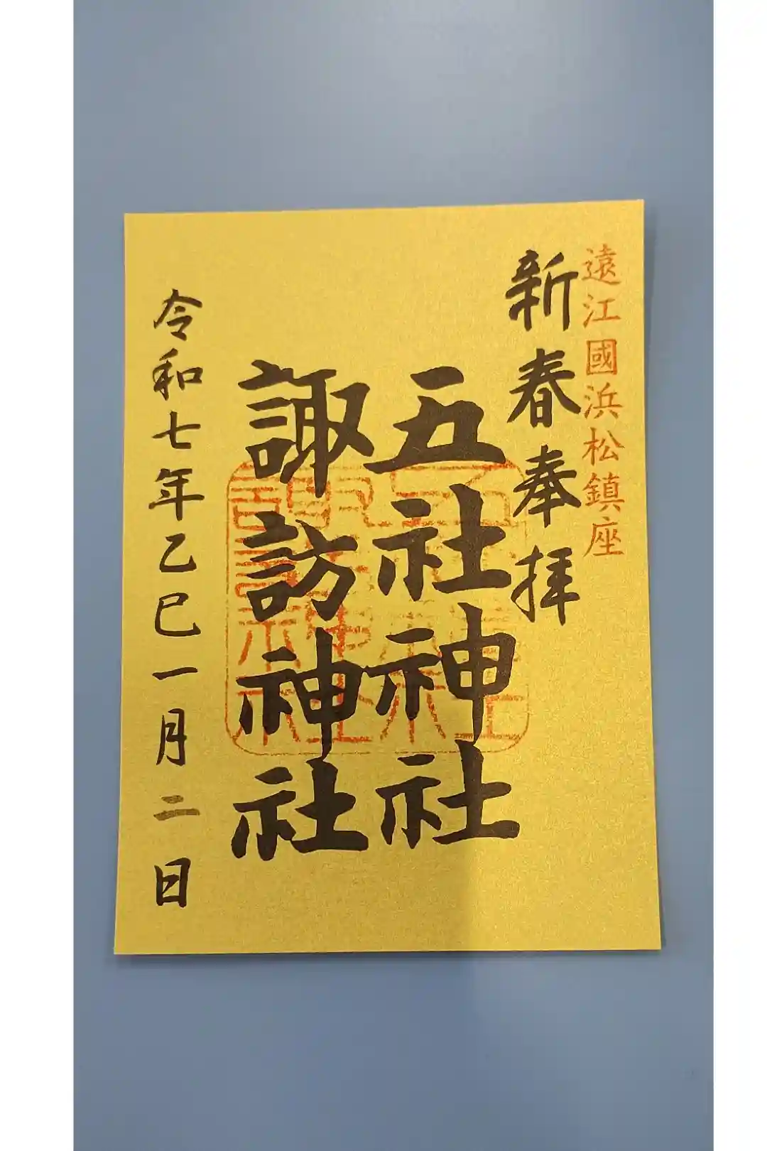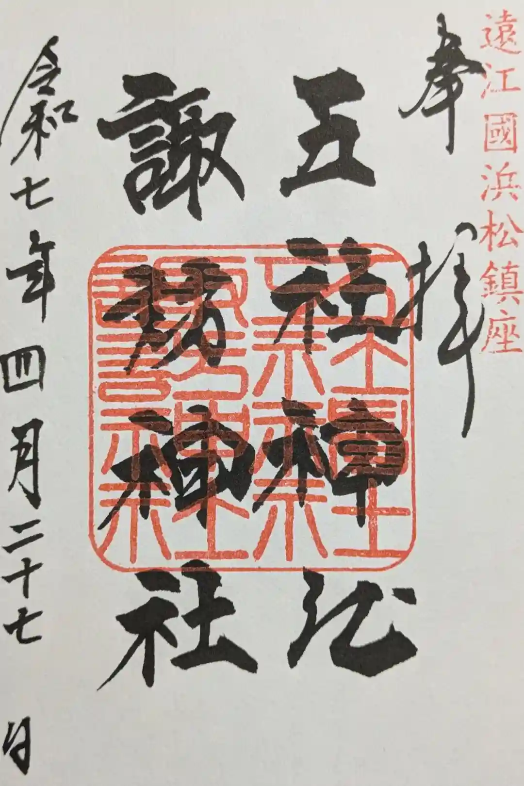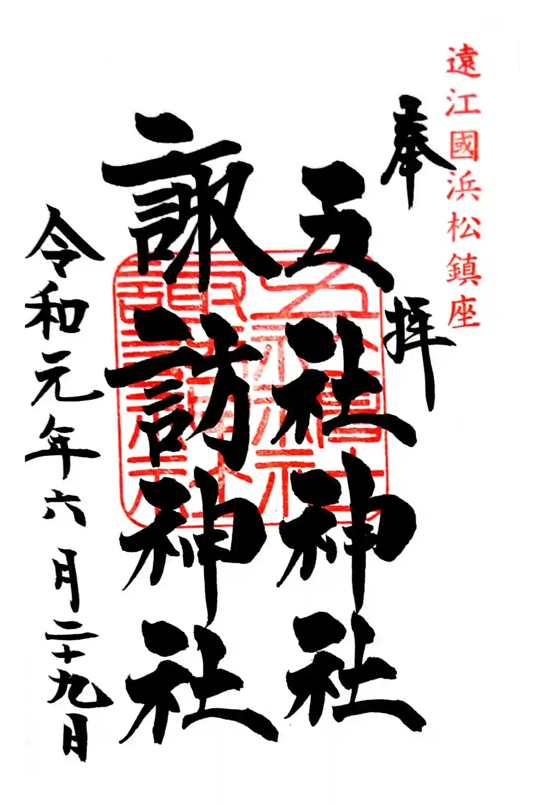 真ん中の右に五社神社、左に諏訪神社と書かれ、右上に遠江國浜松鎮座、五社神社諏訪神社の印が押されています。
