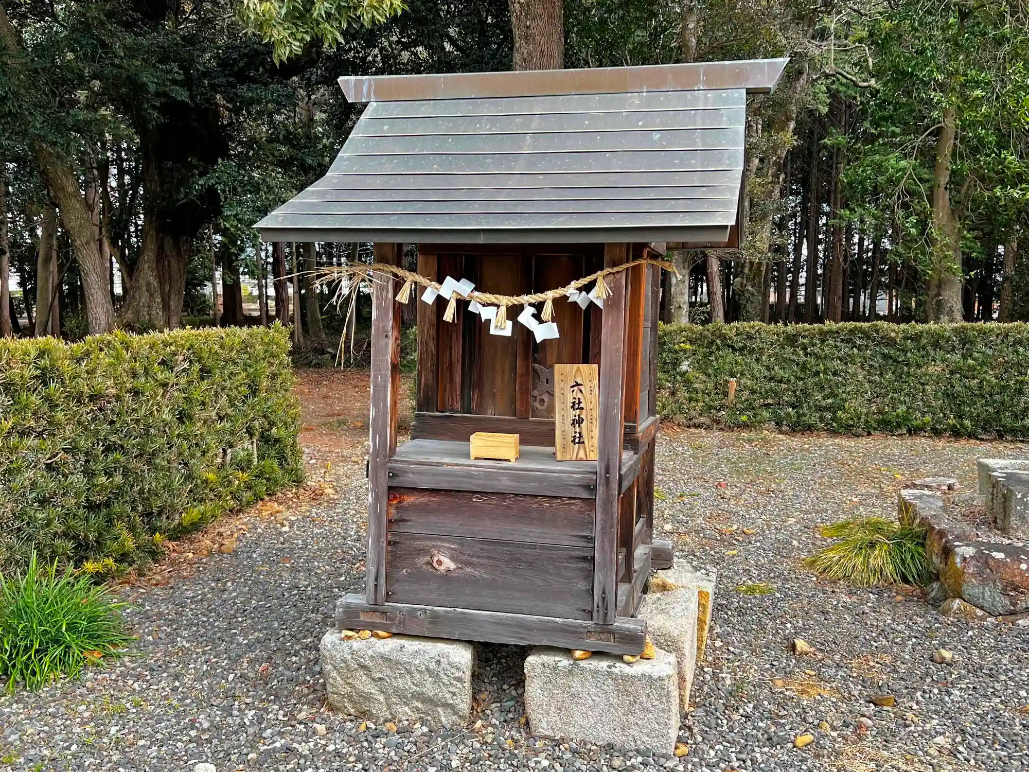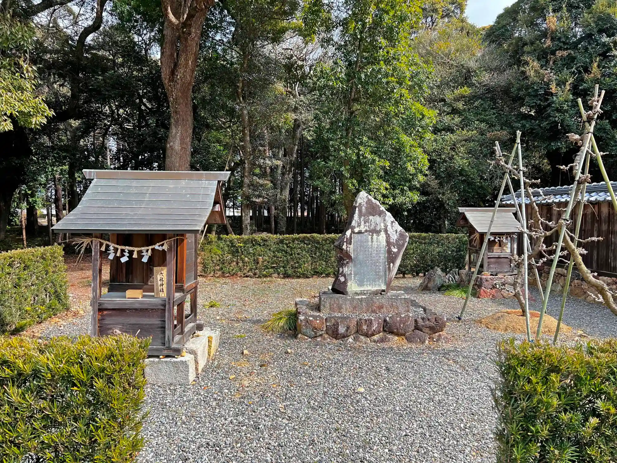 社殿の左側に植栽で囲まれたエリアがあり、境内社が立っている。