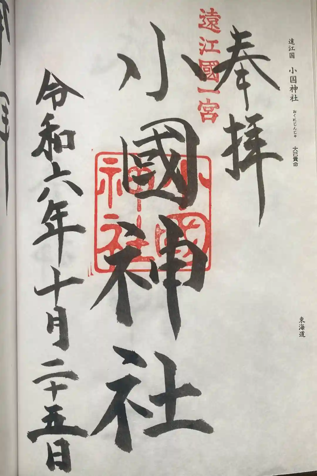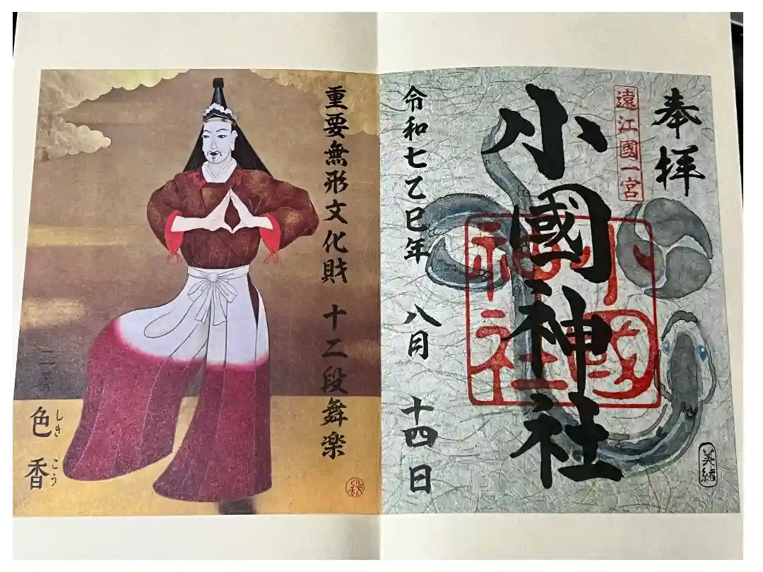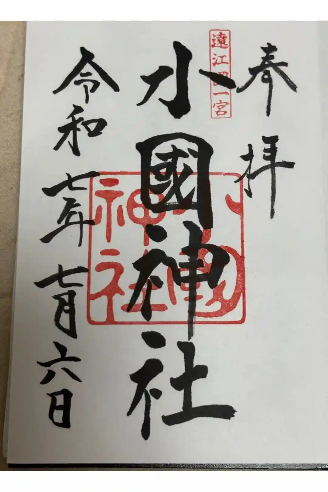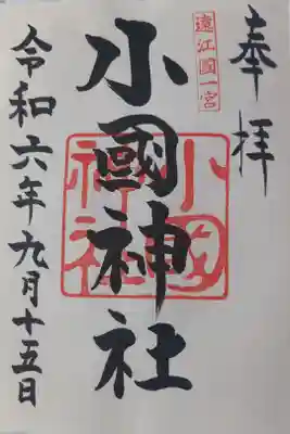 真ん中に小國神社の文字が書かれ、右上に遠江國一之宮、真ん中に小國神社の印が入っています。