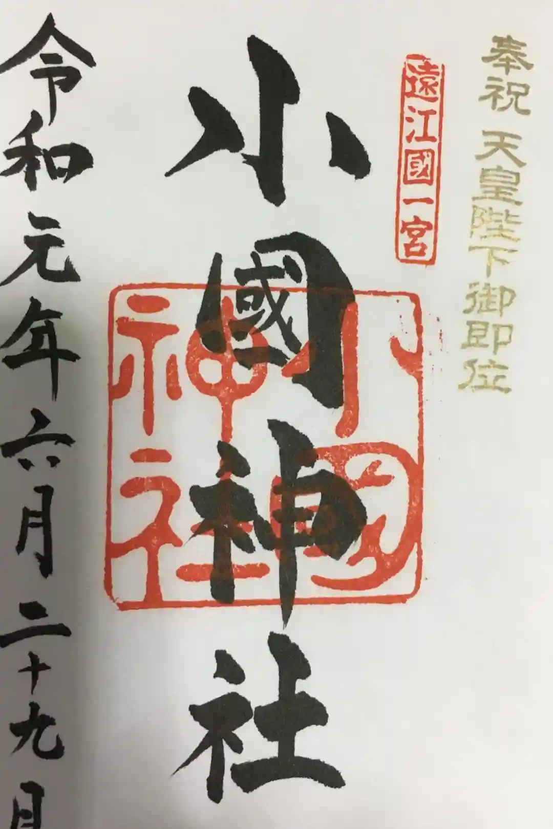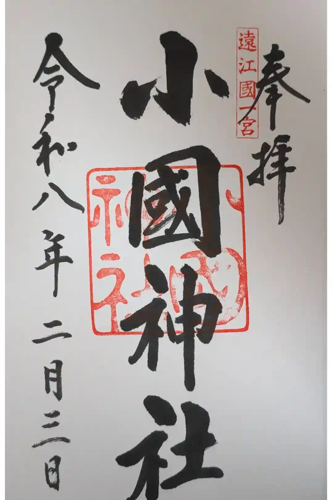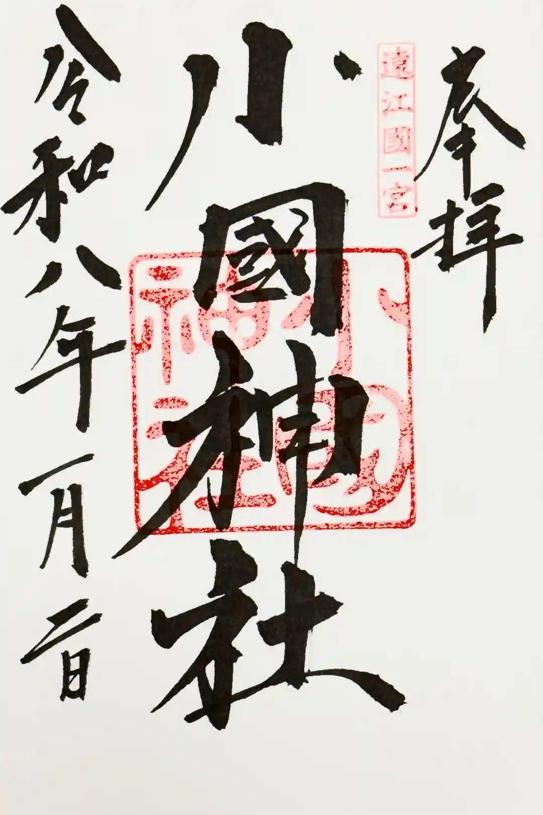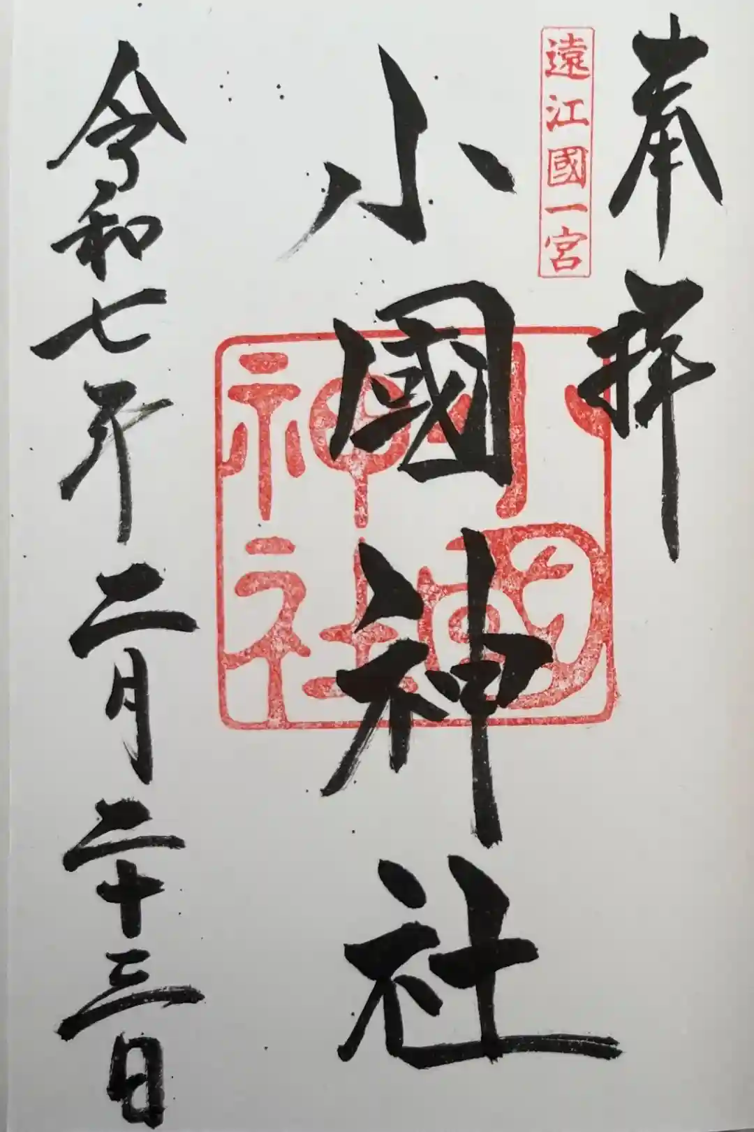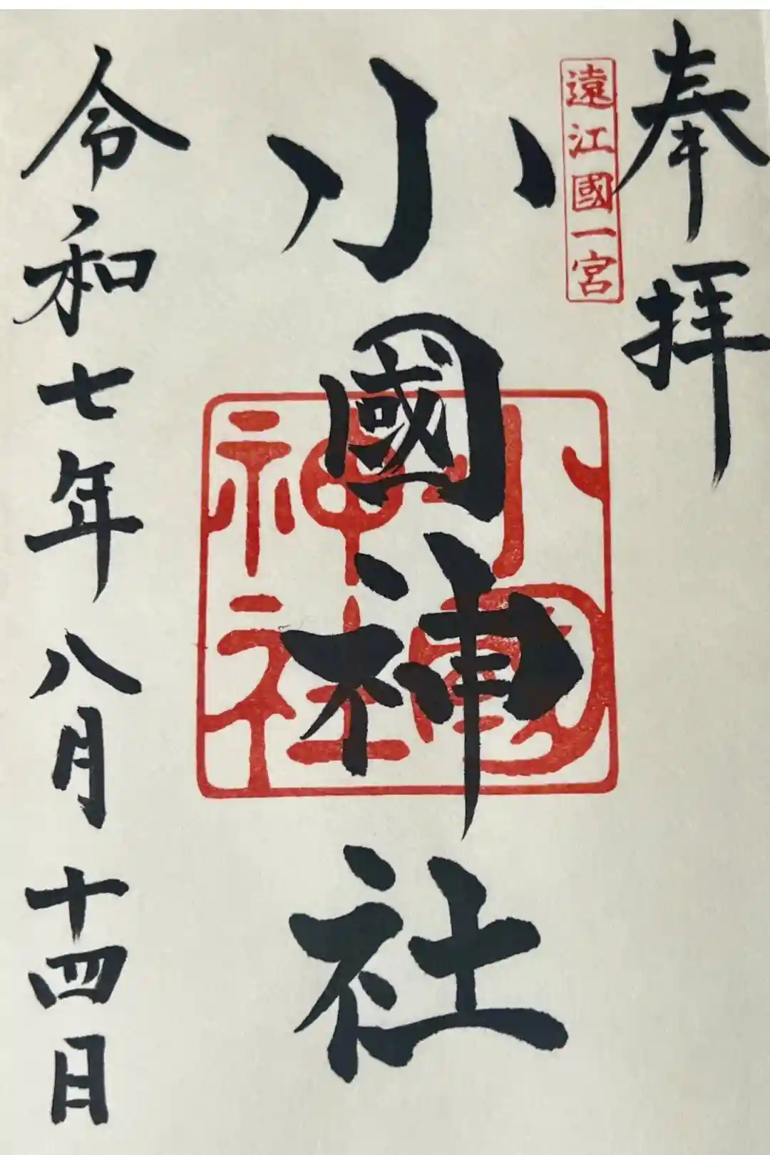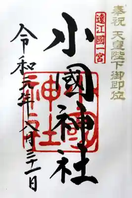 「奉拝」の左側に「遠江國一宮」印、「小國神社」の墨書きの下に神社印が押されています。