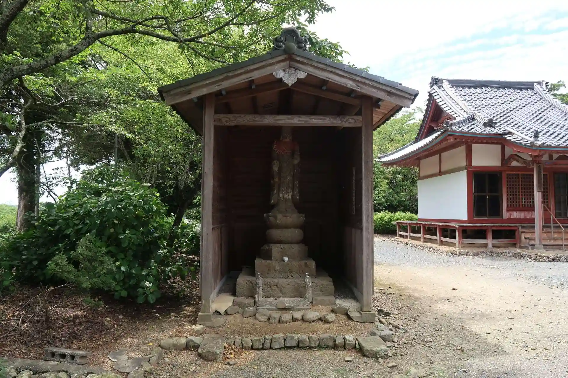 カーナビは本堂境内前の道を左(西)側から案内し、本堂を過ぎた所から境内に入り、駐車しました。下調べせずに行きましたが、本堂境内に向かって南側から真っ直ぐ延びる参道があり(車で走行可)、参道両脇は現在梅畑になっていますが、以前は僧坊が建ち並んでいたそうです。
