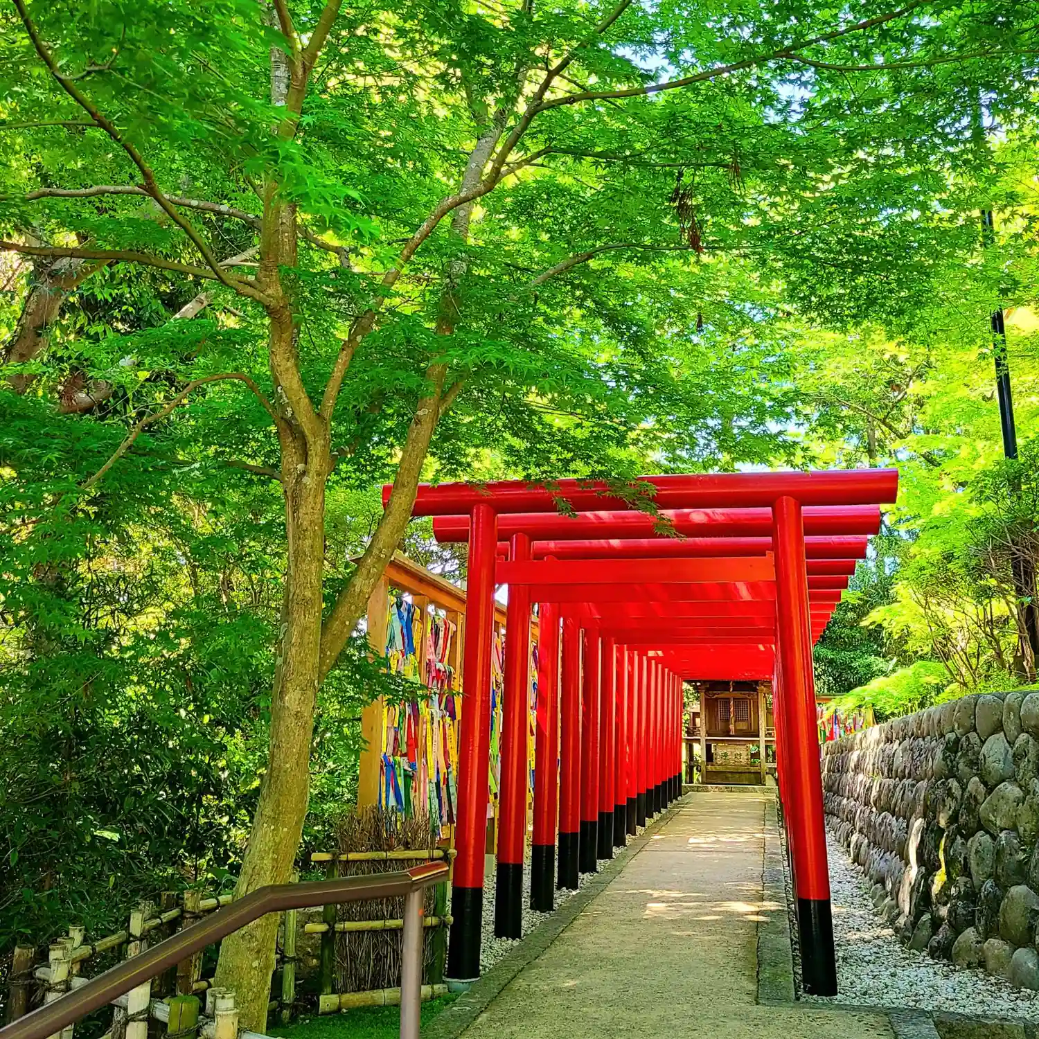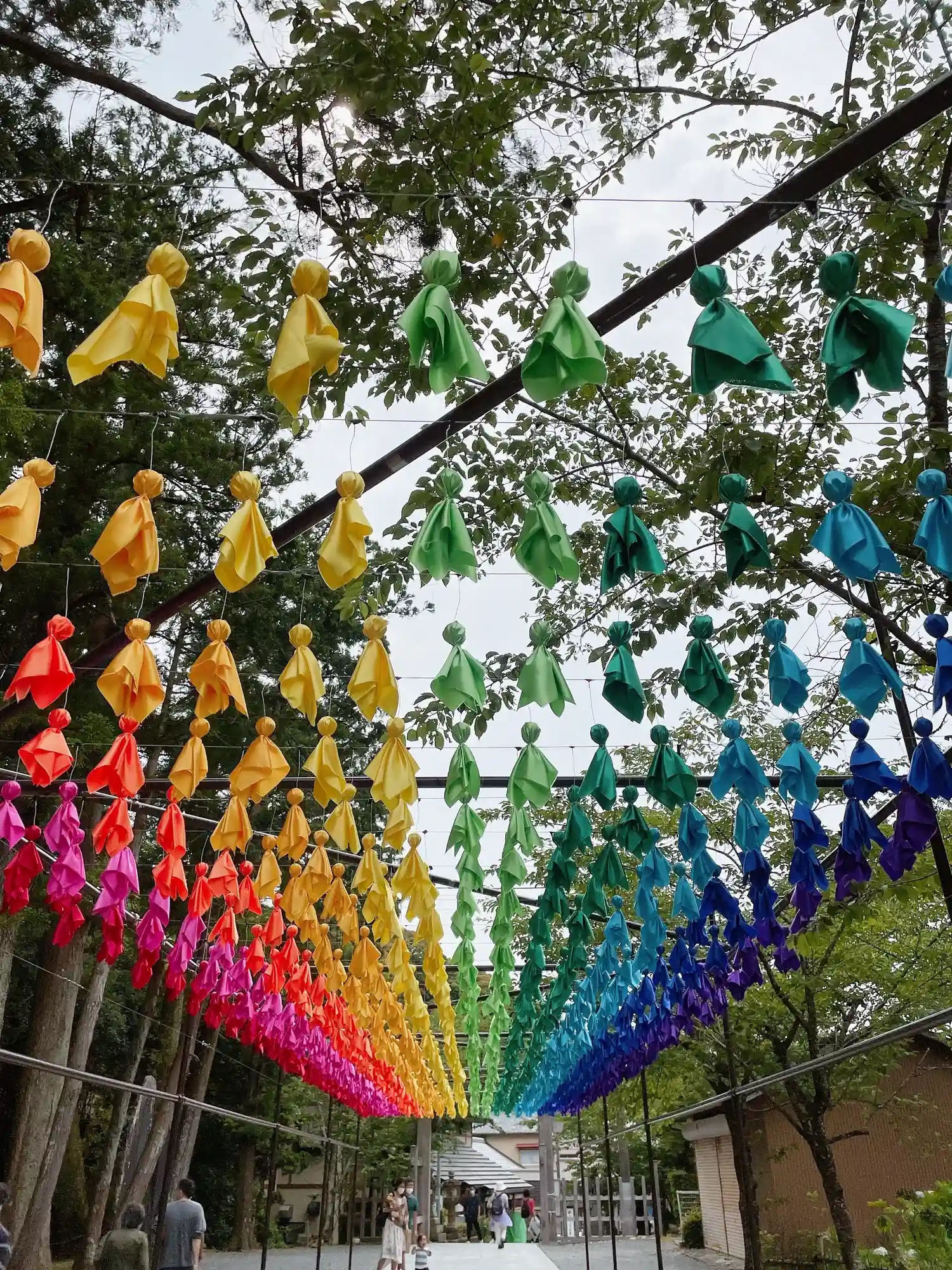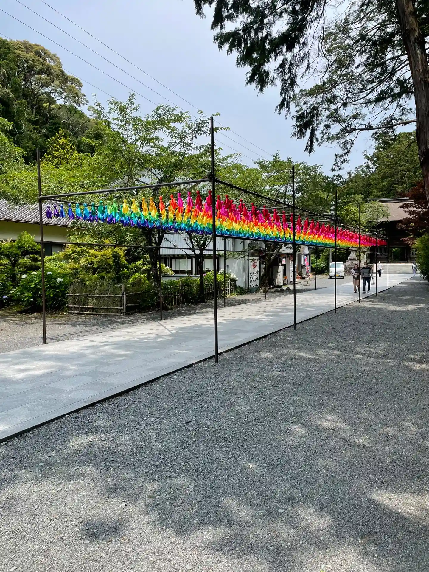 ・虹のてるてる坊主や風鈴まつりをやっていました。境内にある厄除け団子も名物です。