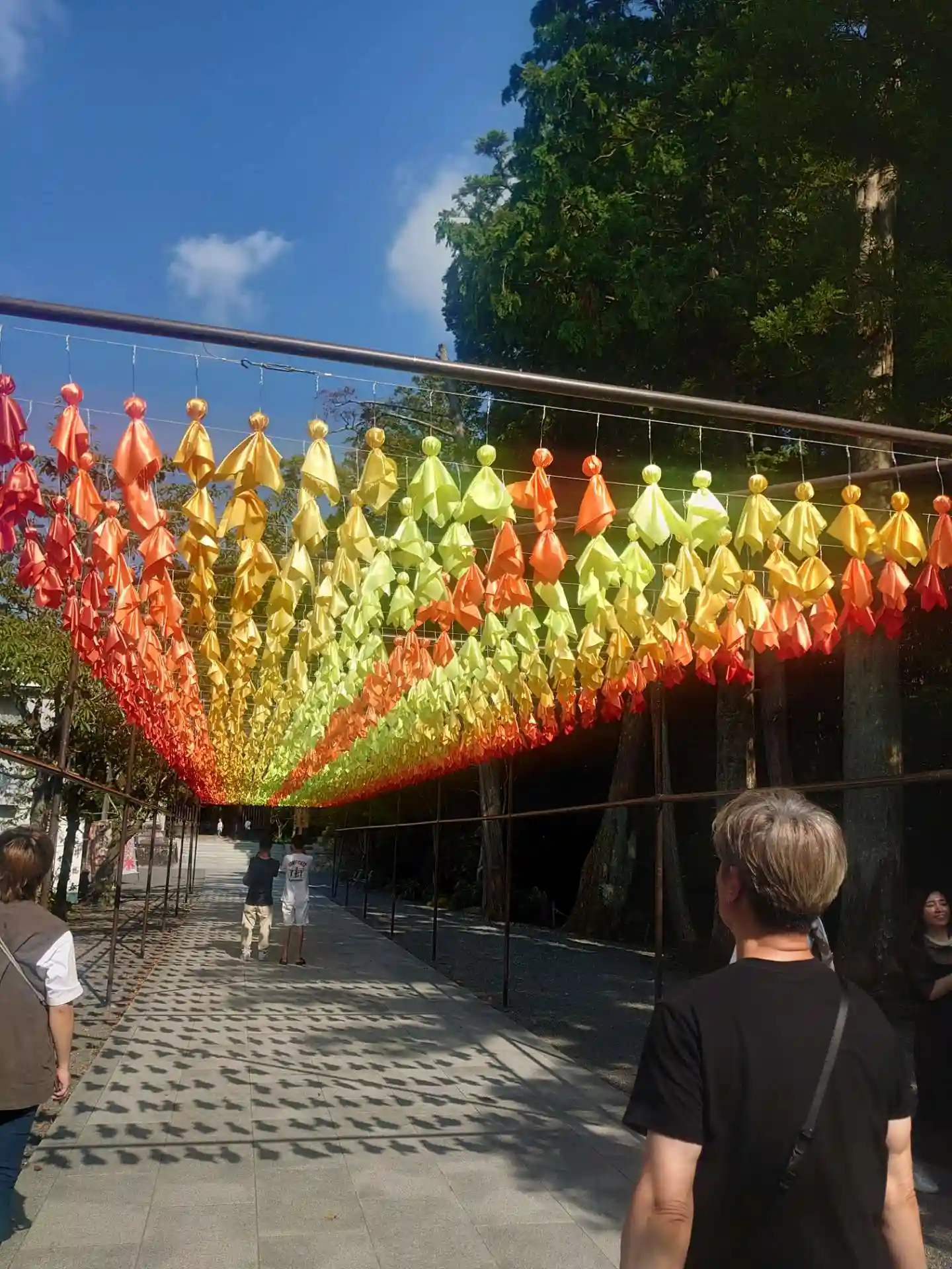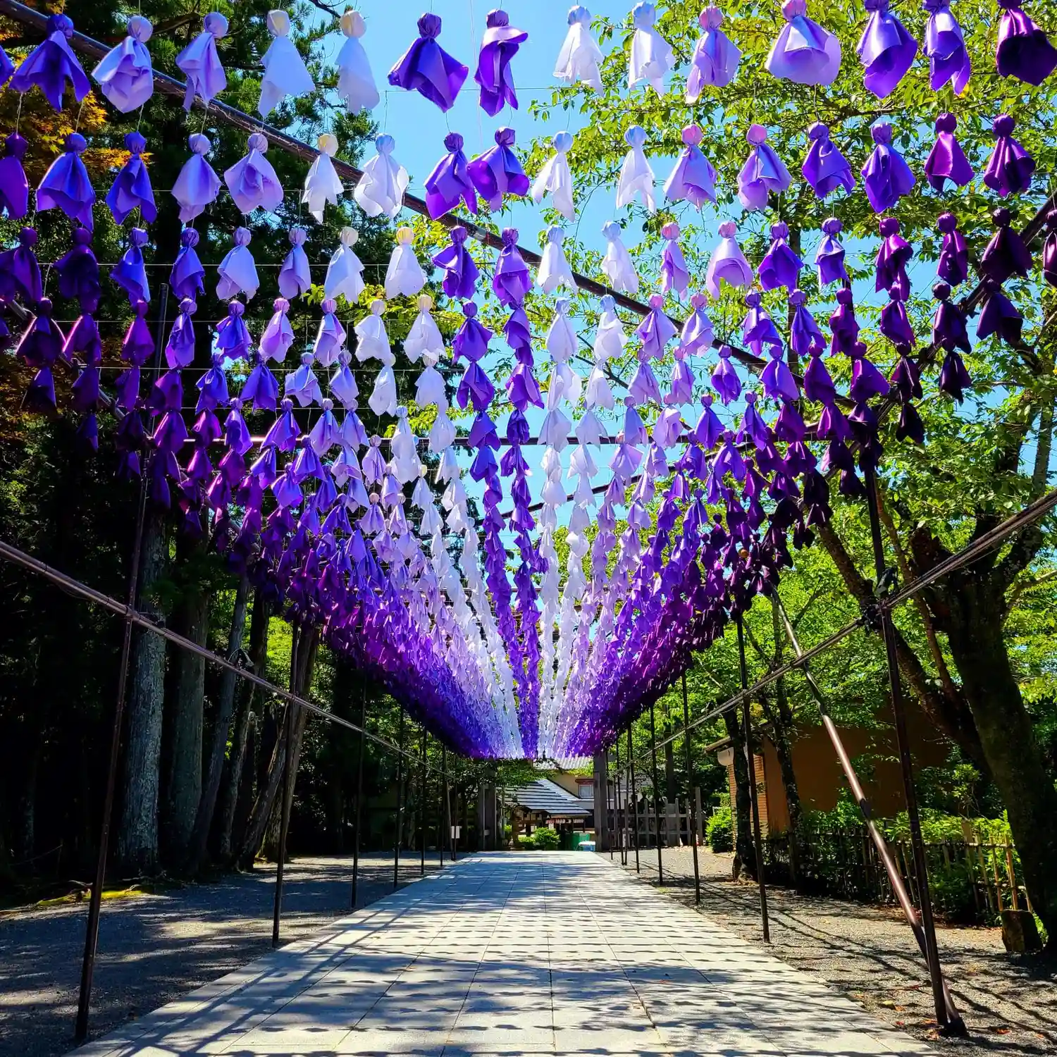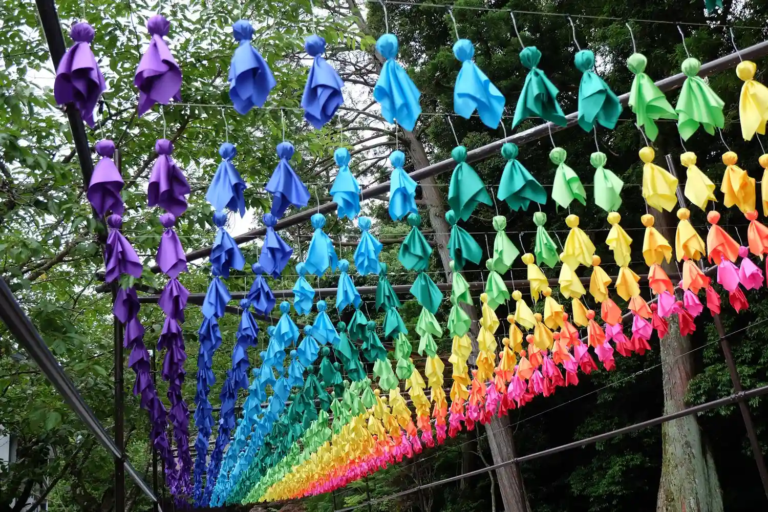 ・虹のてるてる坊主や風鈴まつりをやっていました。境内にある厄除け団子も名物です。