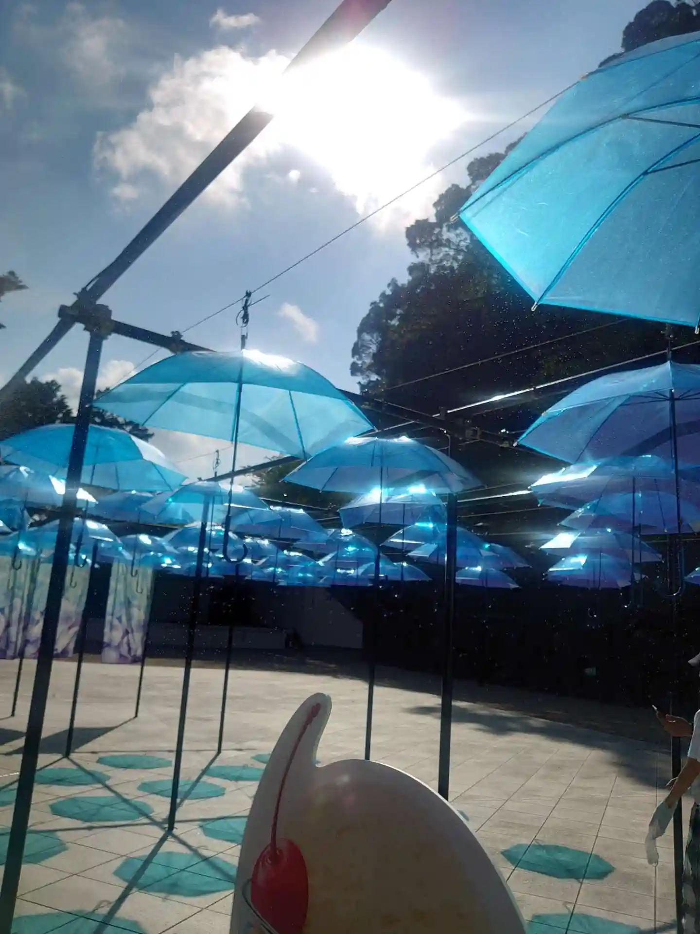 団子売り場近くの広場にあるオブジェ。暑さ対策か?霧が撒かれていました。