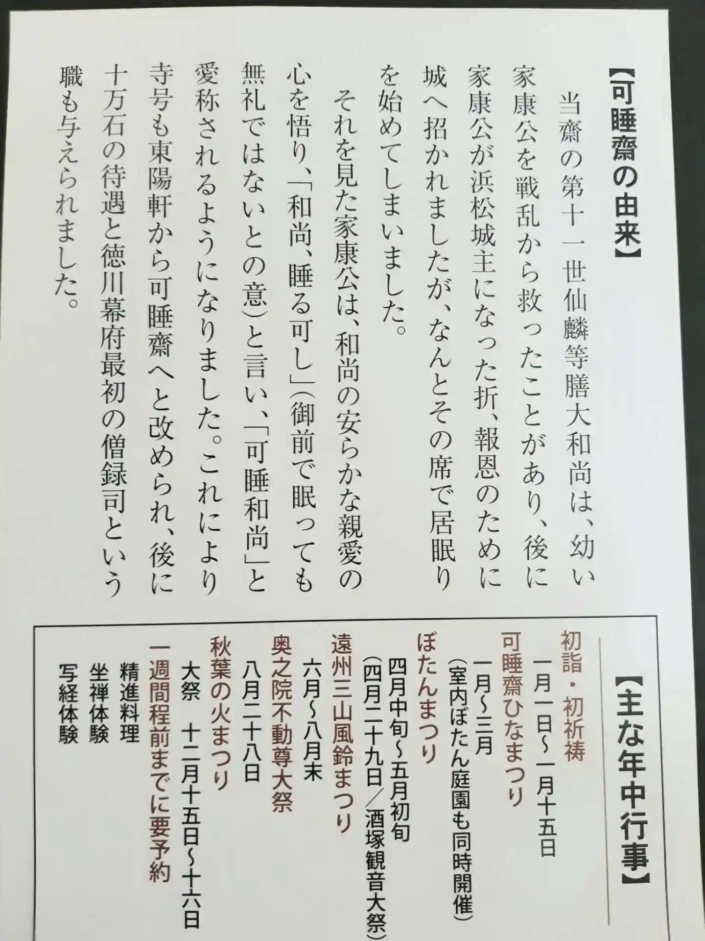 | ご由緒 | 可睡斎の開創は、今からおよそ620有余年前に恕仲天誾(にょちゅうてんぎん)禅師が開いた寺で、万松山東陽軒と名付けたのが始まりとされている。降って十一代仙麟等膳和は、幼い家康を戦乱の中から救い出し岡崎城に送ったことが有り、後に、永禄11年(1568)家康が浜松城主に成ったおり、報恩の為に等膳和尚を城に招いた。その席でコクリコクリと無心に居眠りをする和尚を見て家康公はにっこりせられ『和尚我を見ること愛児の如し、故に安心して眠る、我その親密な情を喜ぶ、和尚眠る可し」と言って、それ以来「可睡和尚」と愛称せられ、後に寺号も万松山可睡斎と改めた後に十万石の待遇と徳川幕府最初の総録司という職を与えられた。