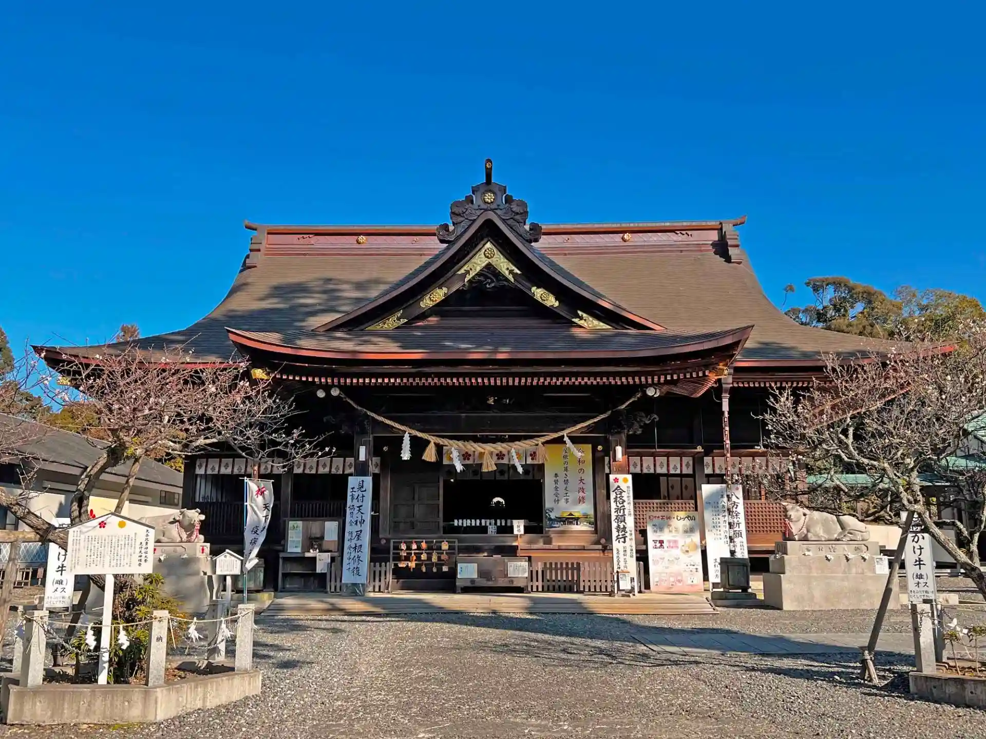 <拝殿>全景。拝殿前の左右両側には<願かけ牛(撫で牛)>が置かれている。