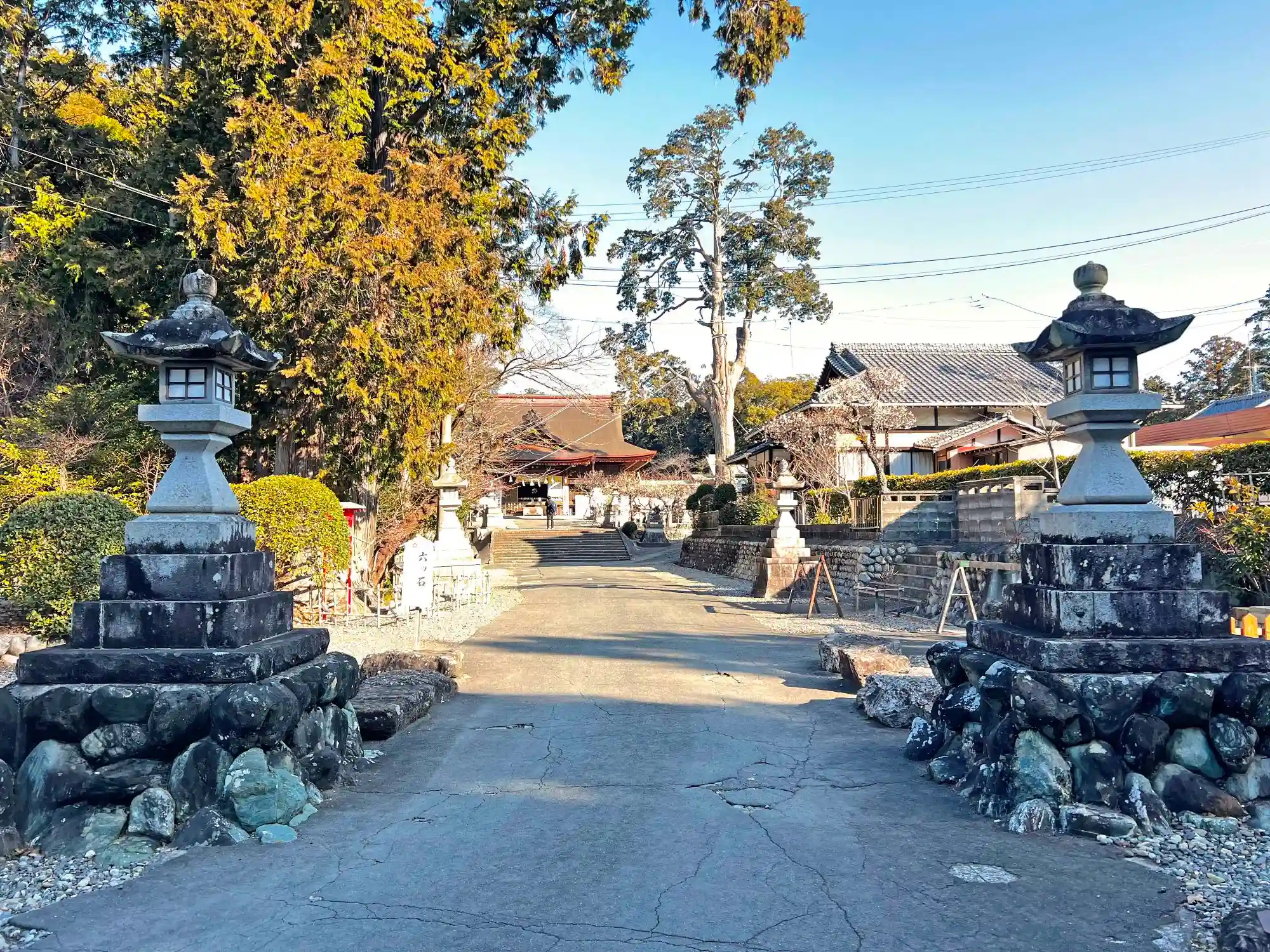 当社は、JR東海道本線・磐田駅の北東2kmほどの小丘の上にある。南側100mのところに東海道(見付宿場通り)が通っている。南北600m、東西200mある小丘の南半分が当社、北半分がつつじ公園(ただし、つつじ公園内に境内社や忠魂碑がある)となっており、かなりの広さがある。境内南端の第一鳥居から入ると、社殿まで250mほどある参道を歩く。社殿は大きく周りも広々としており、大社の趣きが十分。まるできれいに整地された自然公園に来た気分になる。