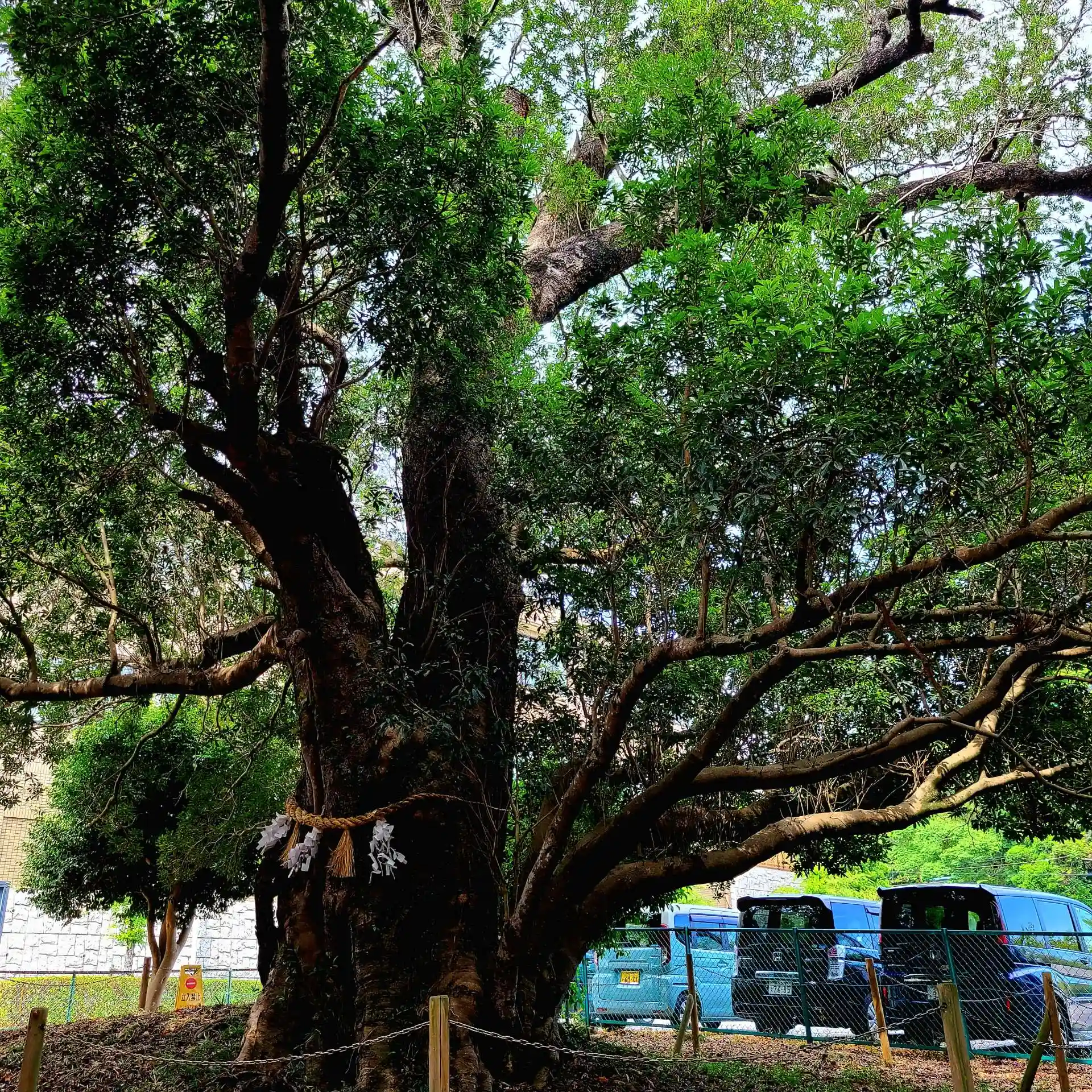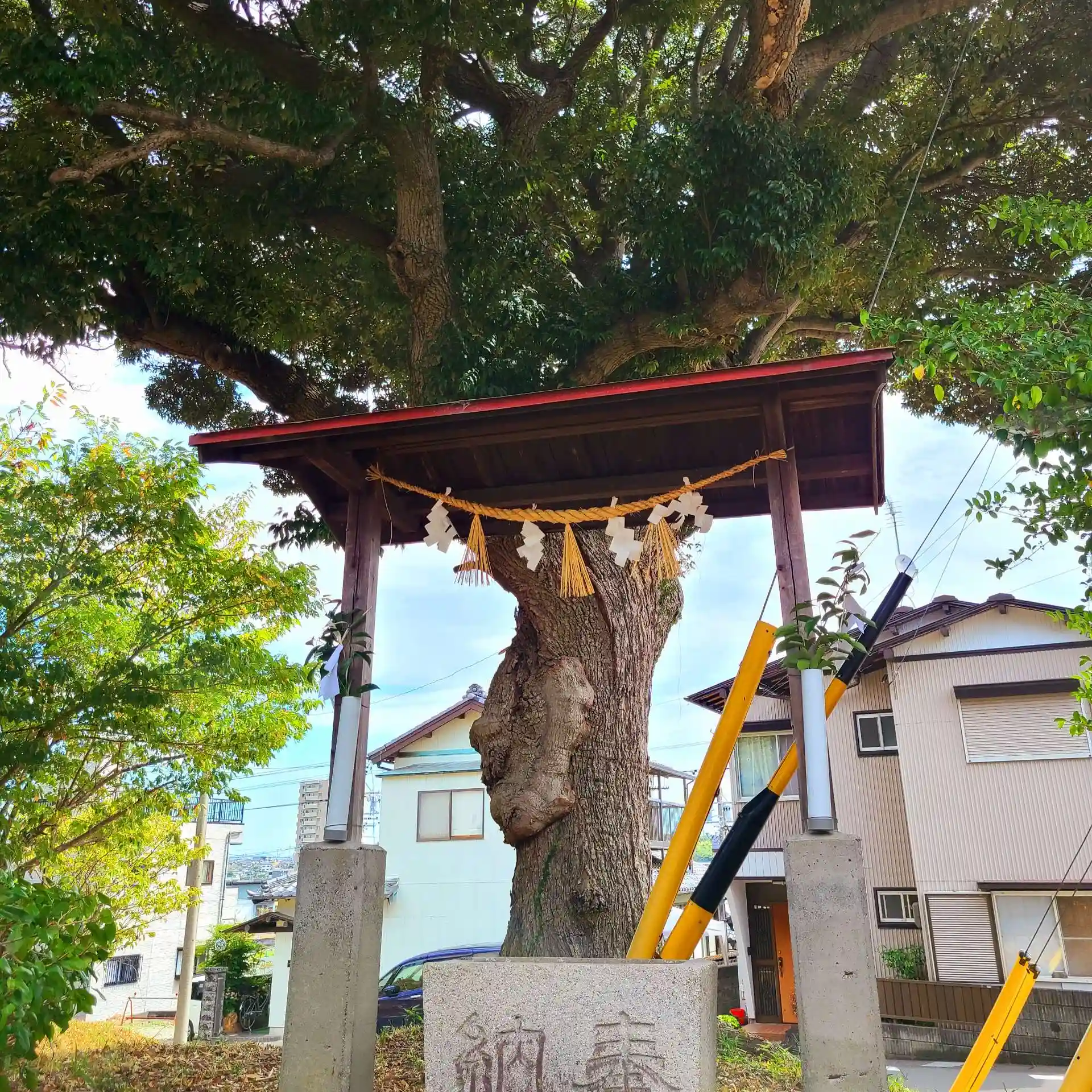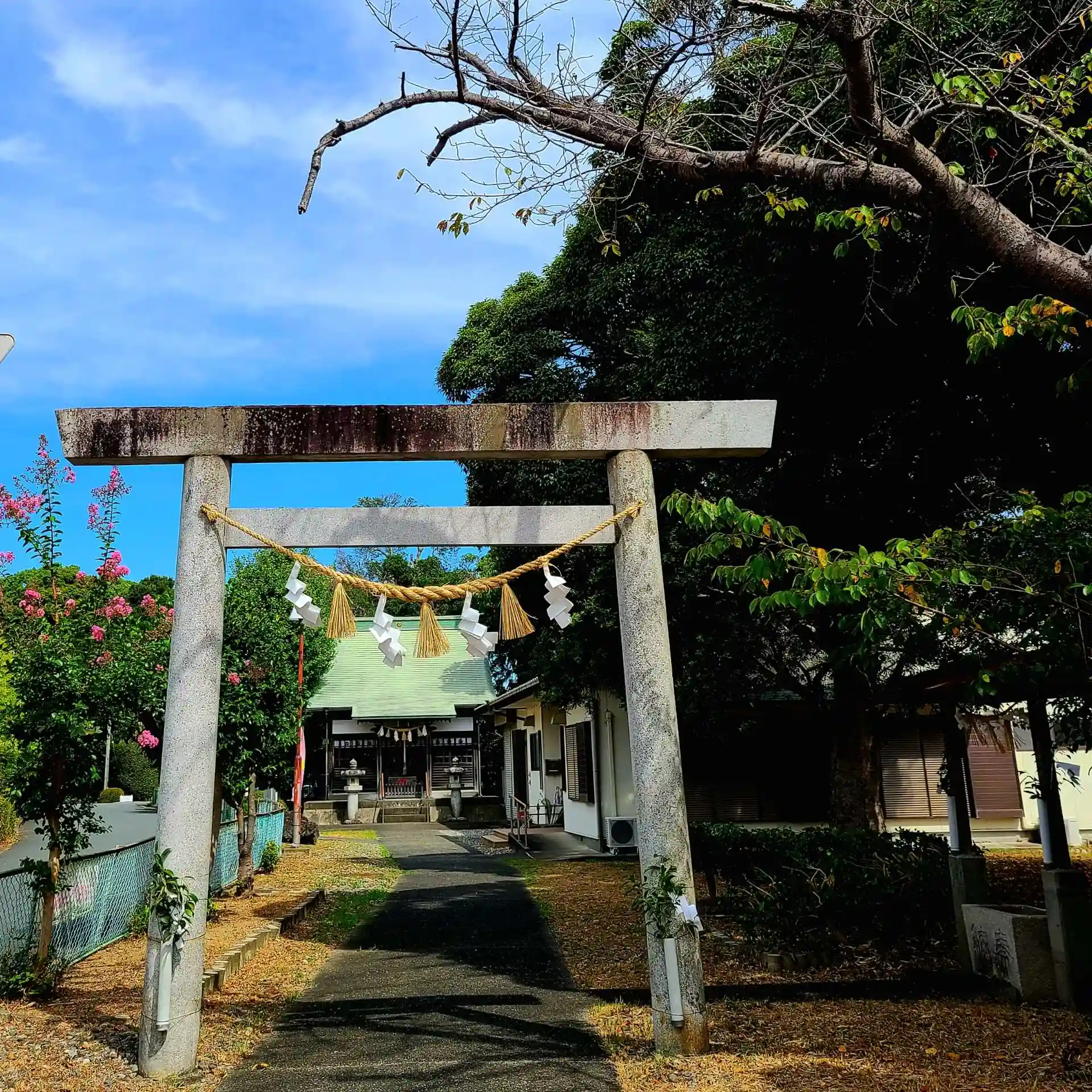 矢奈比売神社(見付天神)、淡海国玉神社と並び「見付三社」と称されますが、現在の御社殿は住宅街の中にひっそりと佇み、その背後に市の天然記念物に指定されているヤマモモの木が樹冠を広げています。