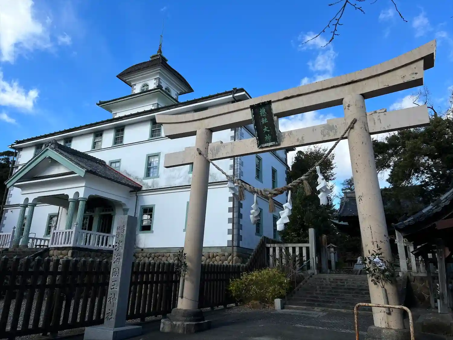 入口鳥居左側にある<旧見付学校>。1875年竣工。当初4階建てで就学児童の増加に伴い、1883年に内部増築で5階建てとなった。国指定史跡。拝観無料。(^▽^)/