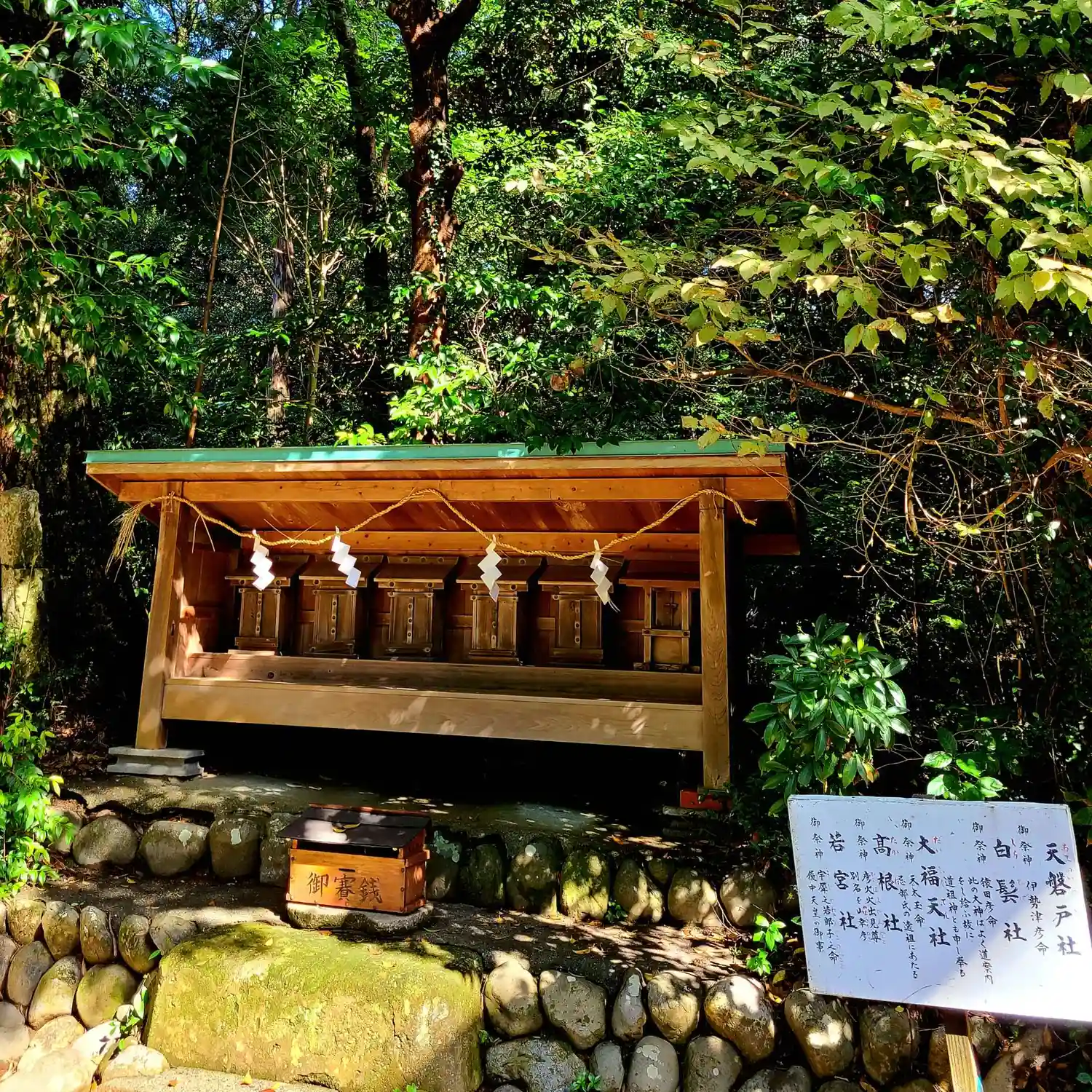 本殿の右側にある境内社群。左から順に<若宮社>、<高根社>、<大福天社>、<白鬚社>、<天磐戸社>、<若宮八幡宮>。