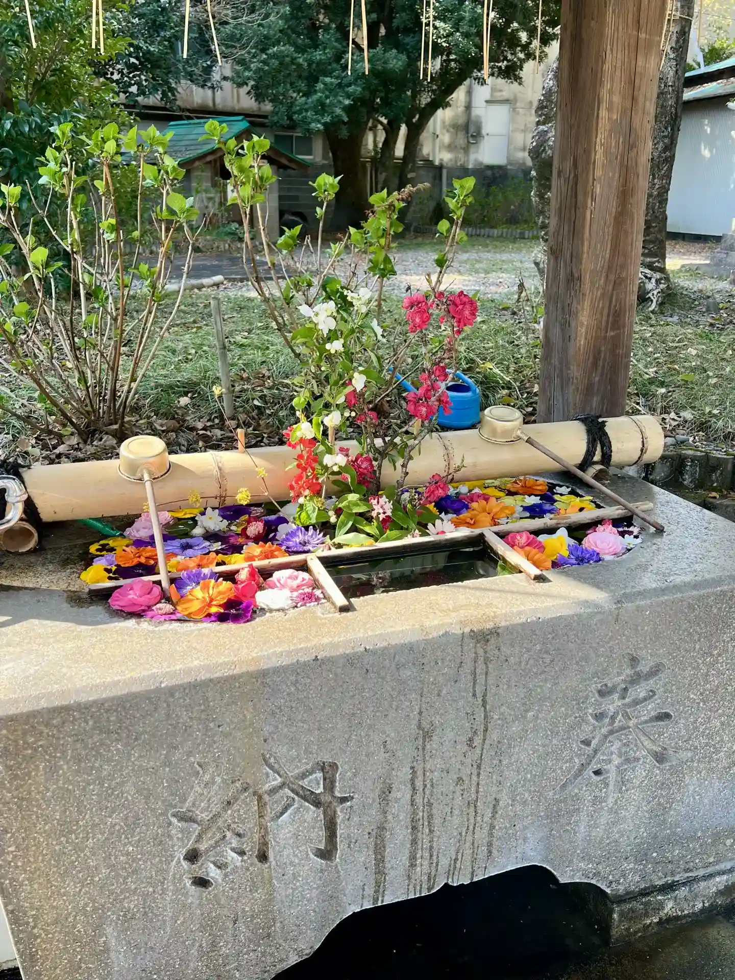 手水舎にキレイなお花で飾られていました。