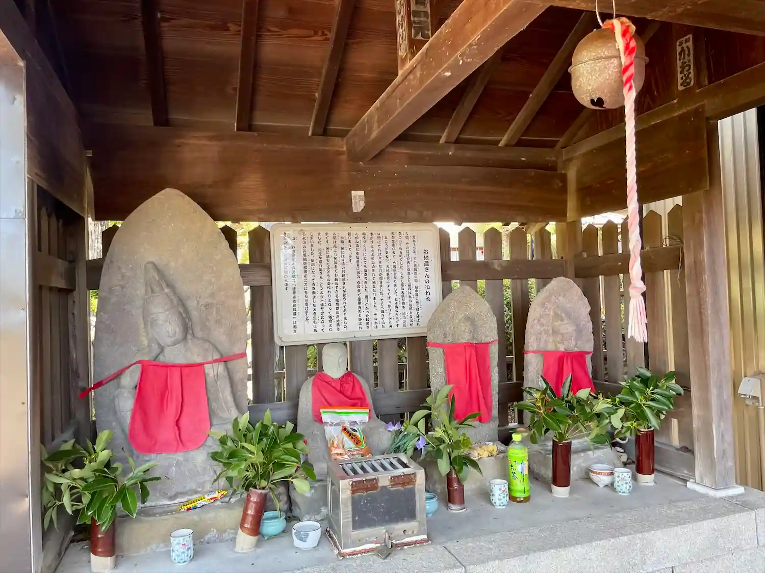 地蔵尊と稲荷神社が隣り合って祀られており、建物の角には庚申塔もある。