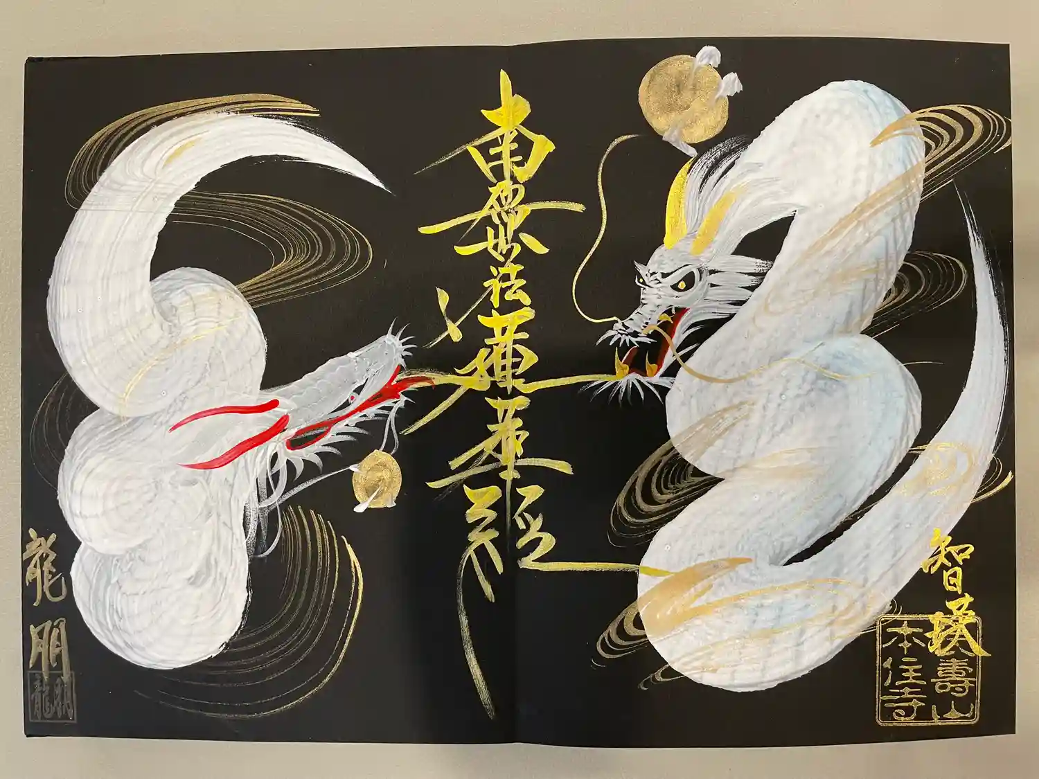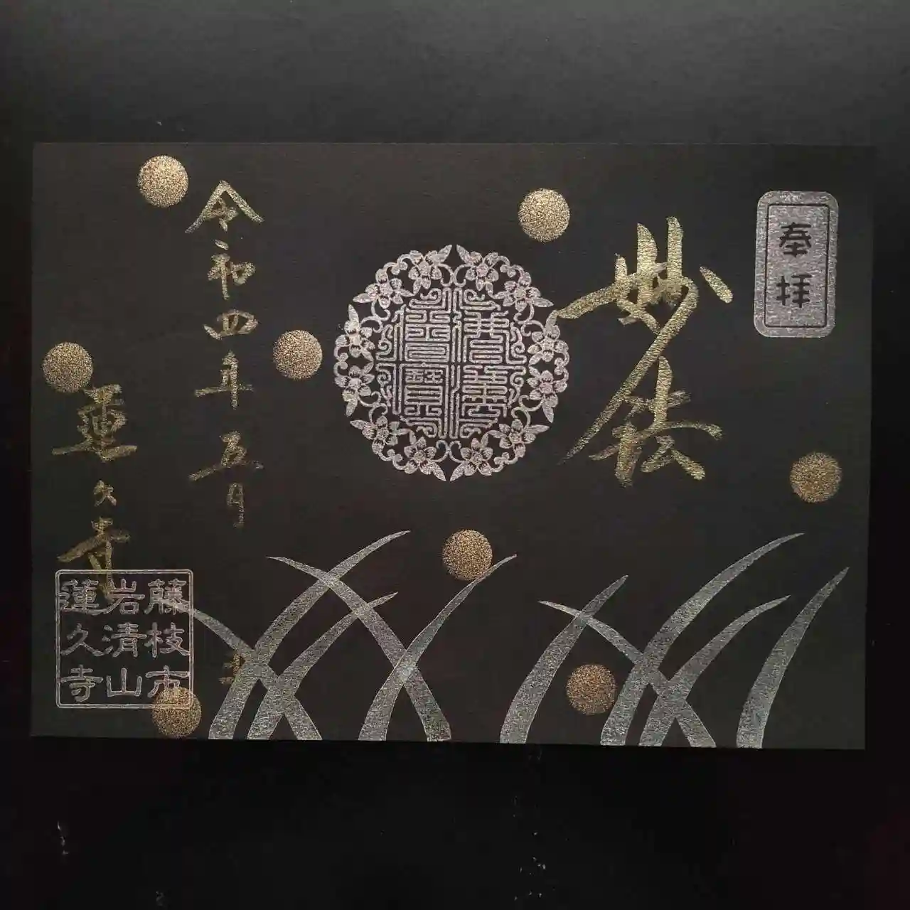 静岡県藤枝市の蓮久寺です。今週も直書き対応の予約が取れたので参拝をしに。黒和紙に金と銀でカラフルな…