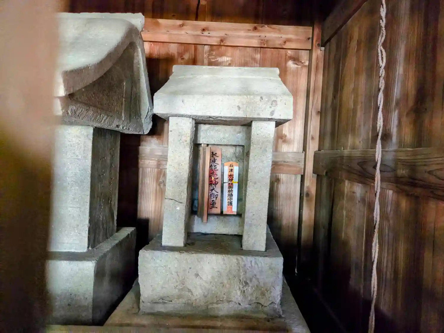 石祠の中に「水波能売神大御璽」 「石津水神社御祈祷守護」札