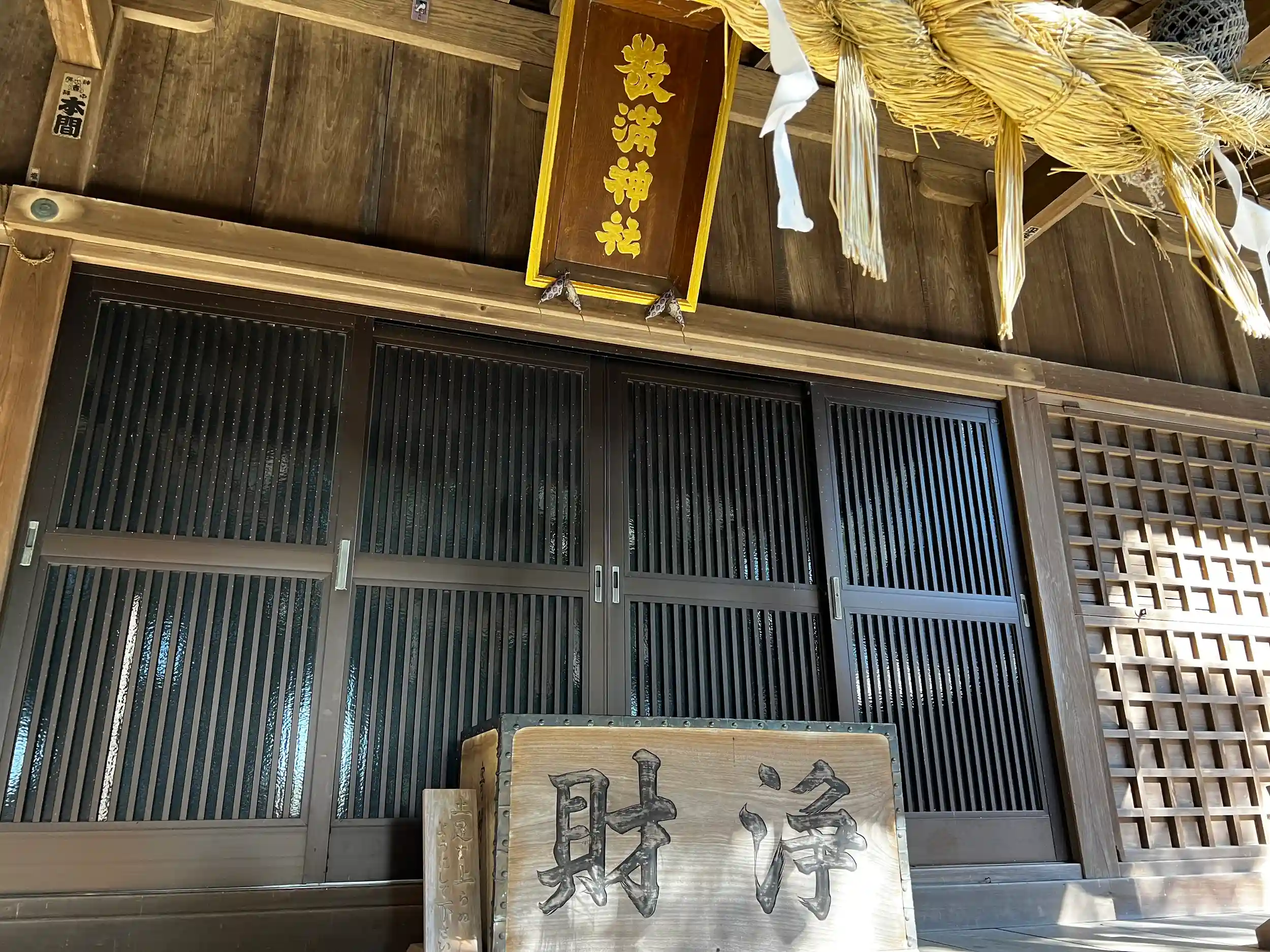 <拝殿>正面。上部にはシンプルな「敬満神社」の扁額。扉はサッシになっていて中をうかがうことはできない。