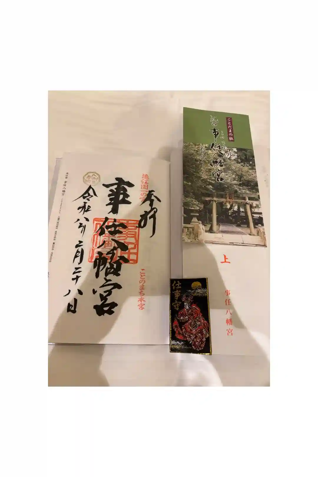 | 御朱印 | あり 真ん中に事任八幡宮のと書かれ、右上に遠江一の宮、真ん中に事任八幡宮、右下にことのまち本宮の印が押されています。