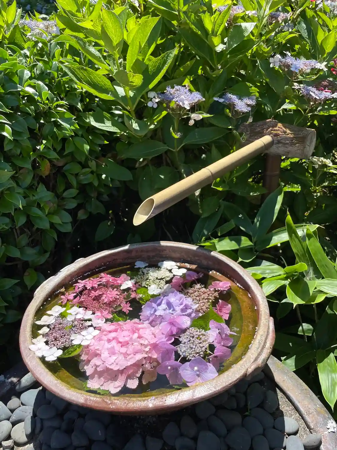 本堂前から左の山には色とりどりの紫陽花が咲き乱れていました