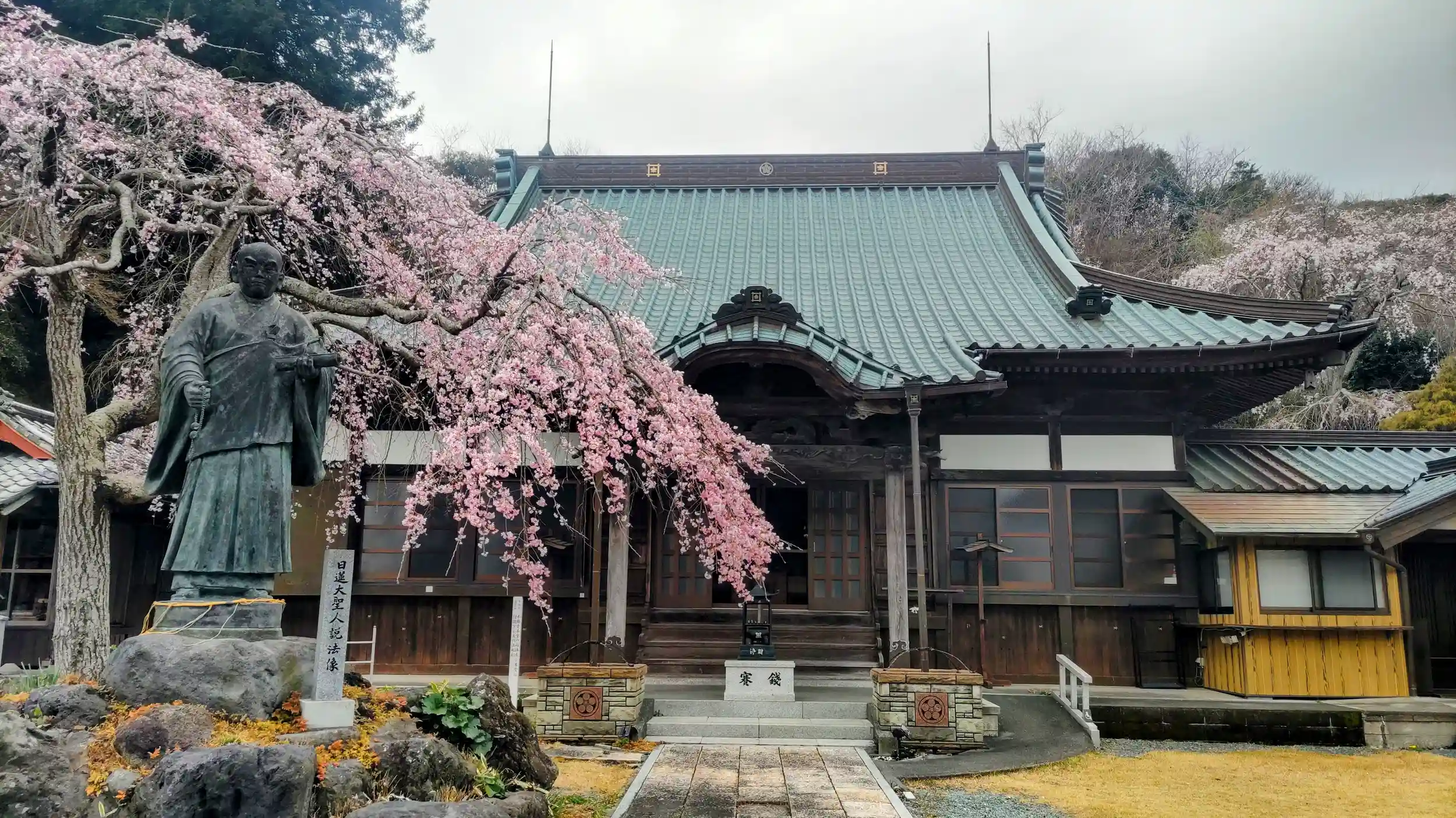 樹木でできた山門や本堂前の桜が印象的でした。