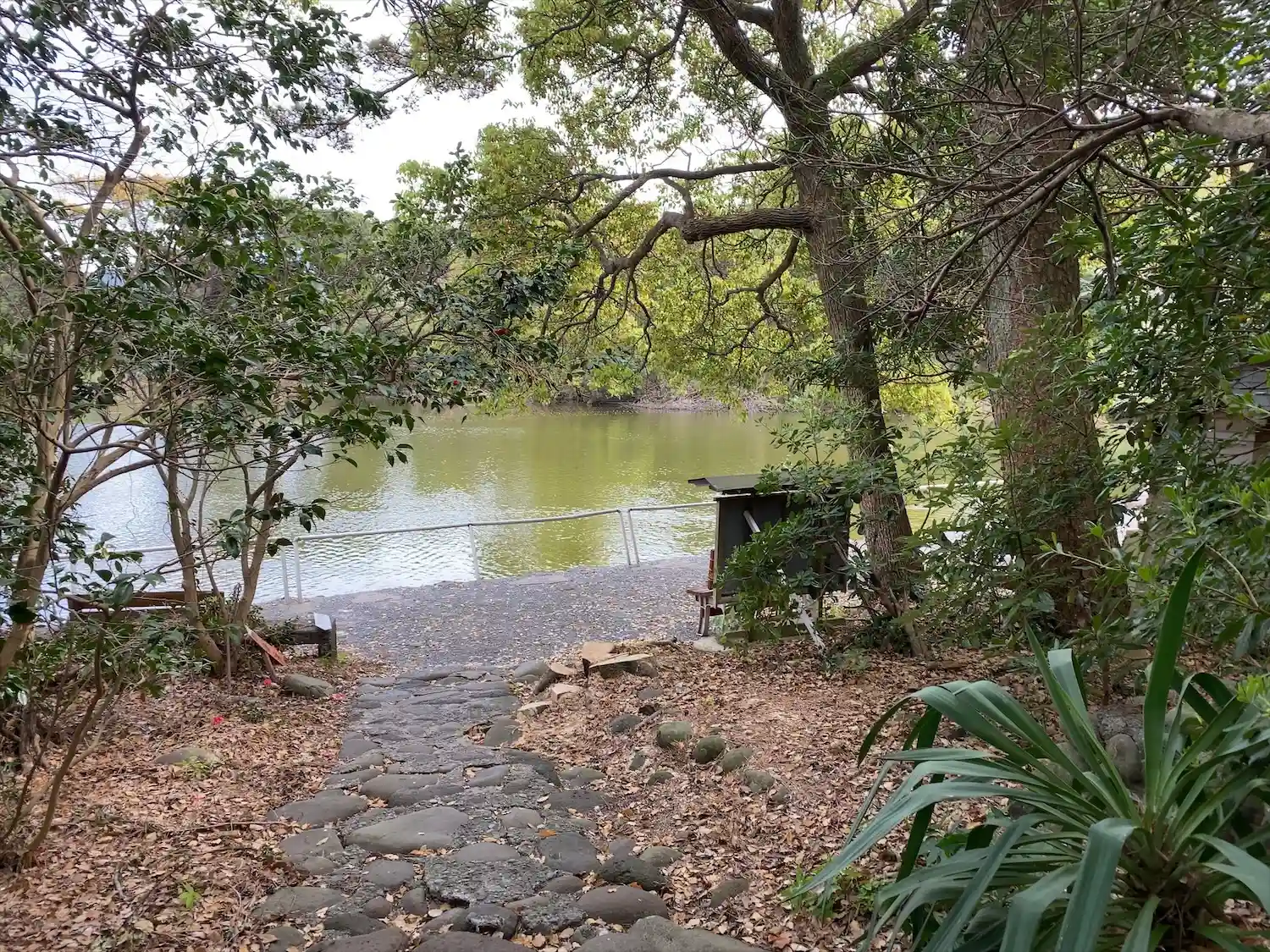 右手の網の向こう側から神池まで20m位でしょうか